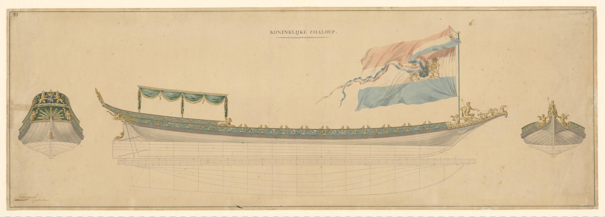 Lijnenplan van de Koningssloep. Zijaanzicht, spantenraam, voor-en achteraanzicht, zijaanzicht, scheepssier van de Koningssloep 1818.