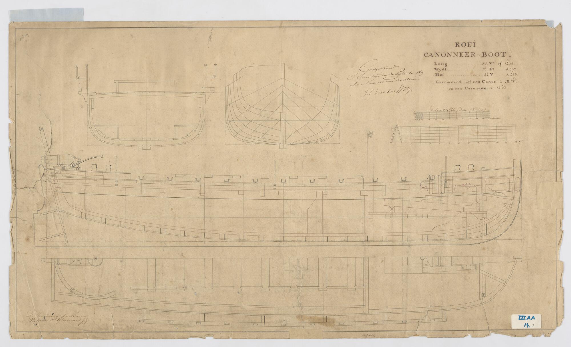 Verticale langsdoorsnede, bovenaanzicht, dwarsdoorsnede, spantenraam en outriggers voor 22 riemen van een roeikanonneerboot met een kanon van 18 pond en een caronnade van 12 pond. Afmetingen van de boot 50 x 12 x 5½ voet.