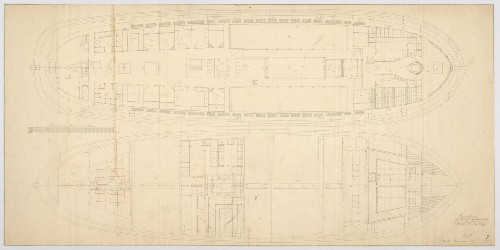 Verticale langsdoorsnede en bovenaanzicht tussendek, koebrugdek en ruim.van het linieschip 'Kortenaer'.