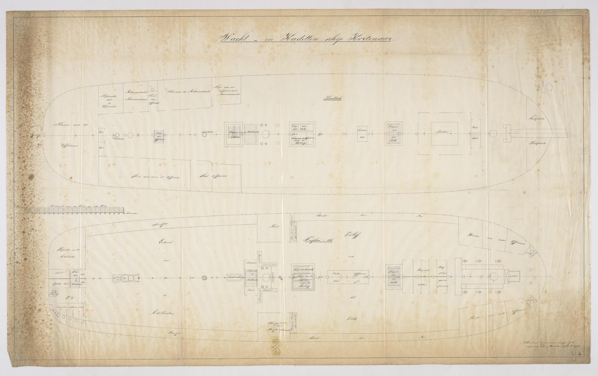 Verticale langsdoorsnede en bovenaanzicht van het kuil- en tussendek van het wachtschip ex-linieschip 'Kortenaer'.