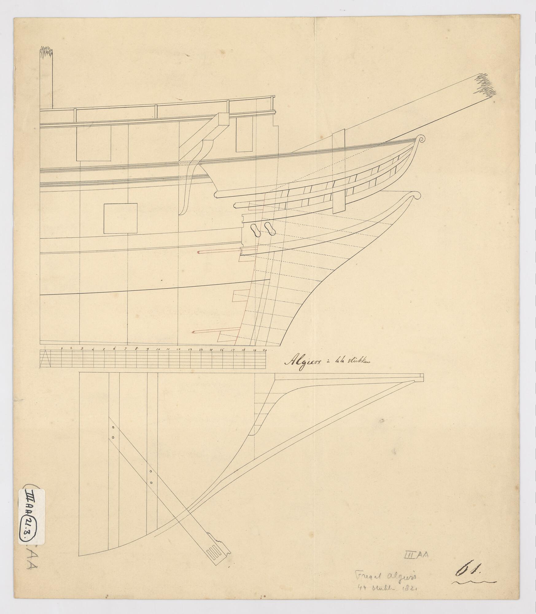 Scheg met galjoen van het fregat Zr.Ms. Algiers van 44 stukken. De Algiers werd in 1828 omgedoopt tot Zr.Ms. Sambre.