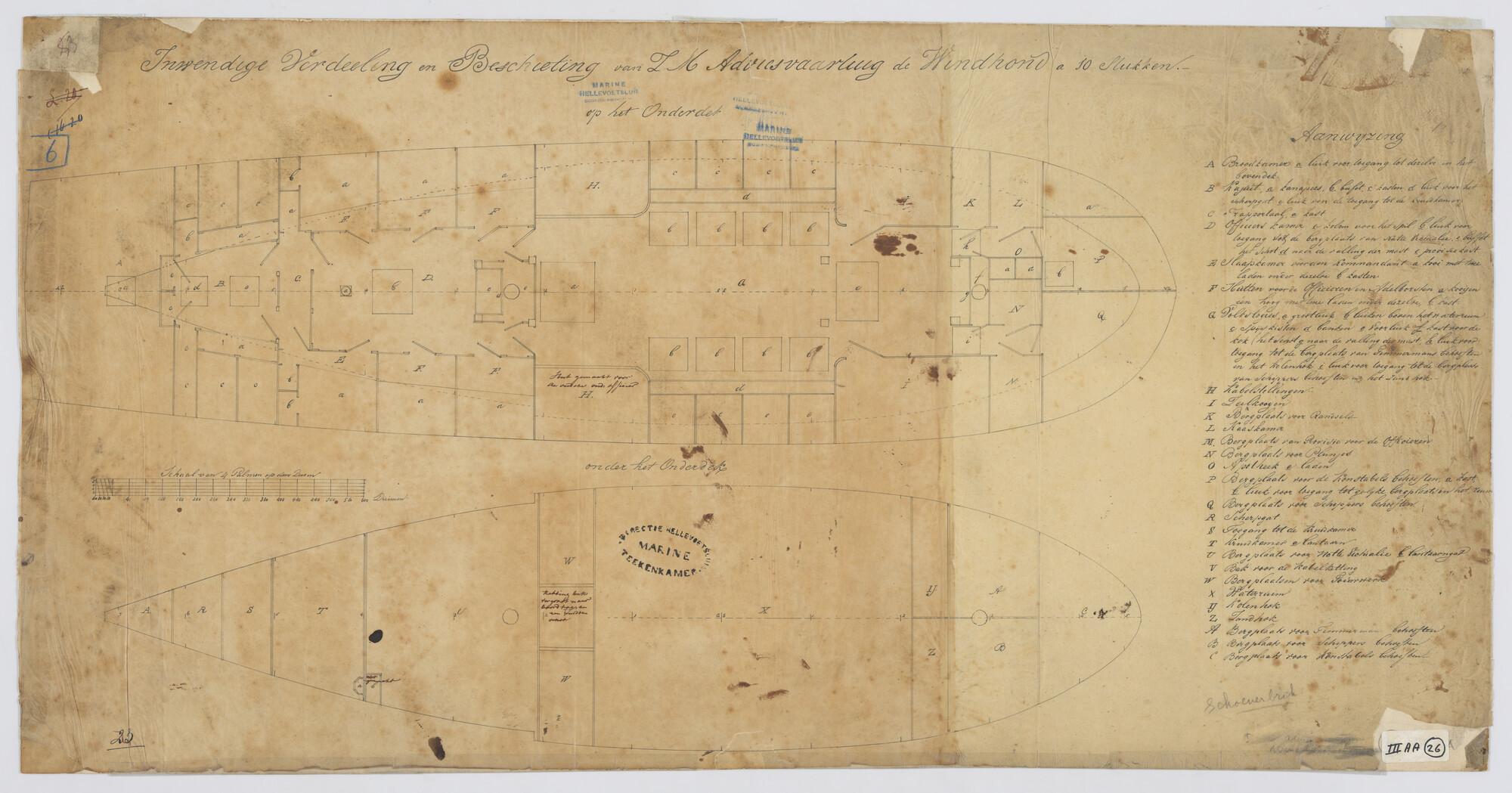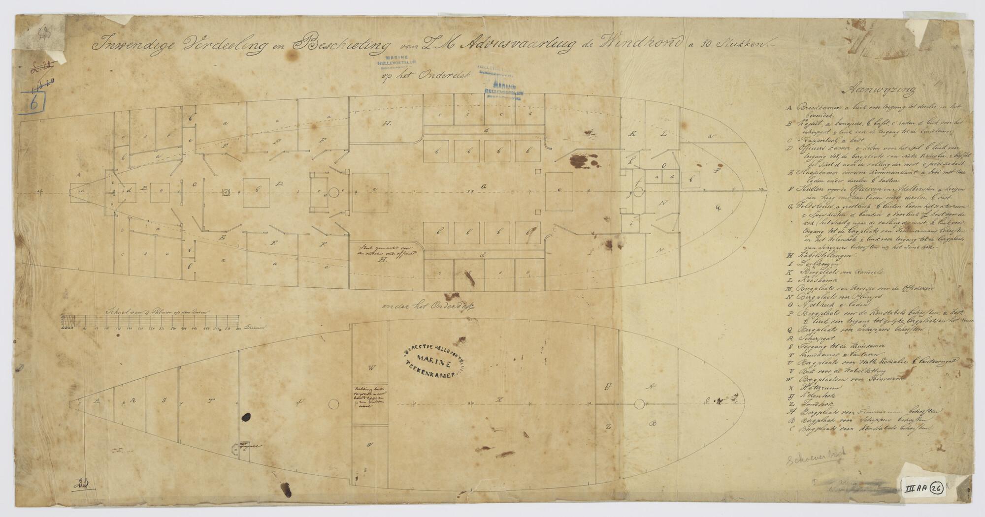 Indeling onderdek en ruimt met beschrijving van de adviesbrik Zr.Ms. 'Windhond' à 10 stukken De afmetingen van het schip zijn 26.5 x 7.5 x 3.8 ellen.
