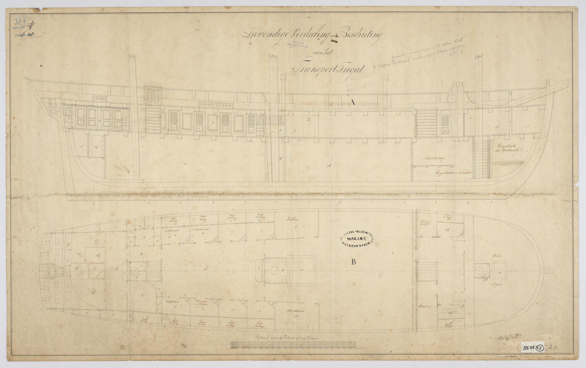 Verticale langsdoorsnede, en indeling tussendek. van een transport-fregat. Afmetingenvan het schip 33.7 x 8.94 x 3.75 ellen.