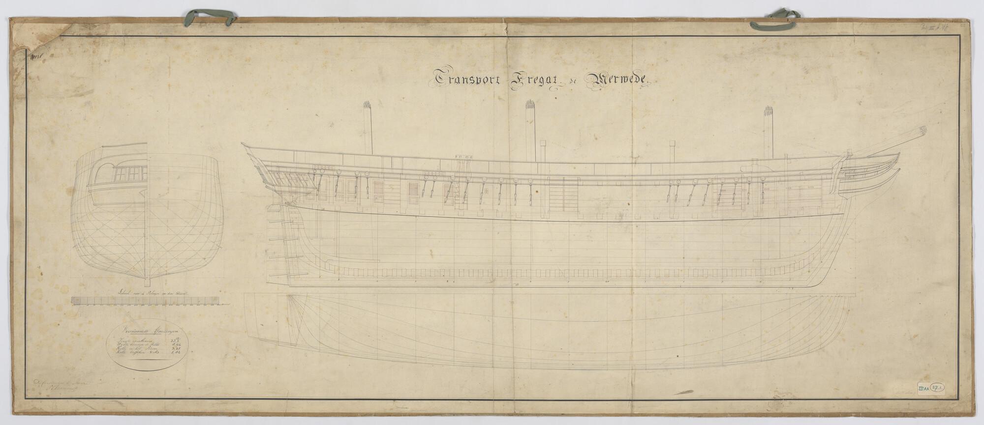 Zijaanzicht, verticale langsdoorsnede, spantenraam, met spiegel waterlijnen, senten van het transport-fregat Zr.Ms. 'Merwede'.