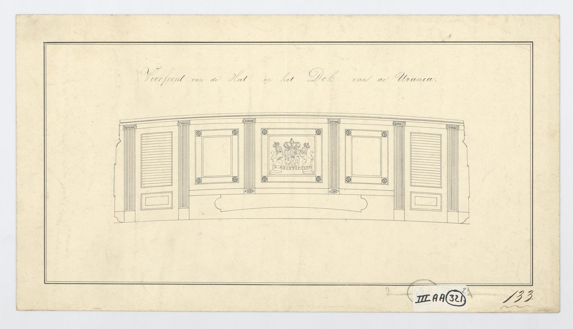 Voorzijde van het dekhuist met in het midden het Nederlandse wapen met de tekst Je Maintiendrai, van het instructievaartuig Zr.Ms. 'Urania'.