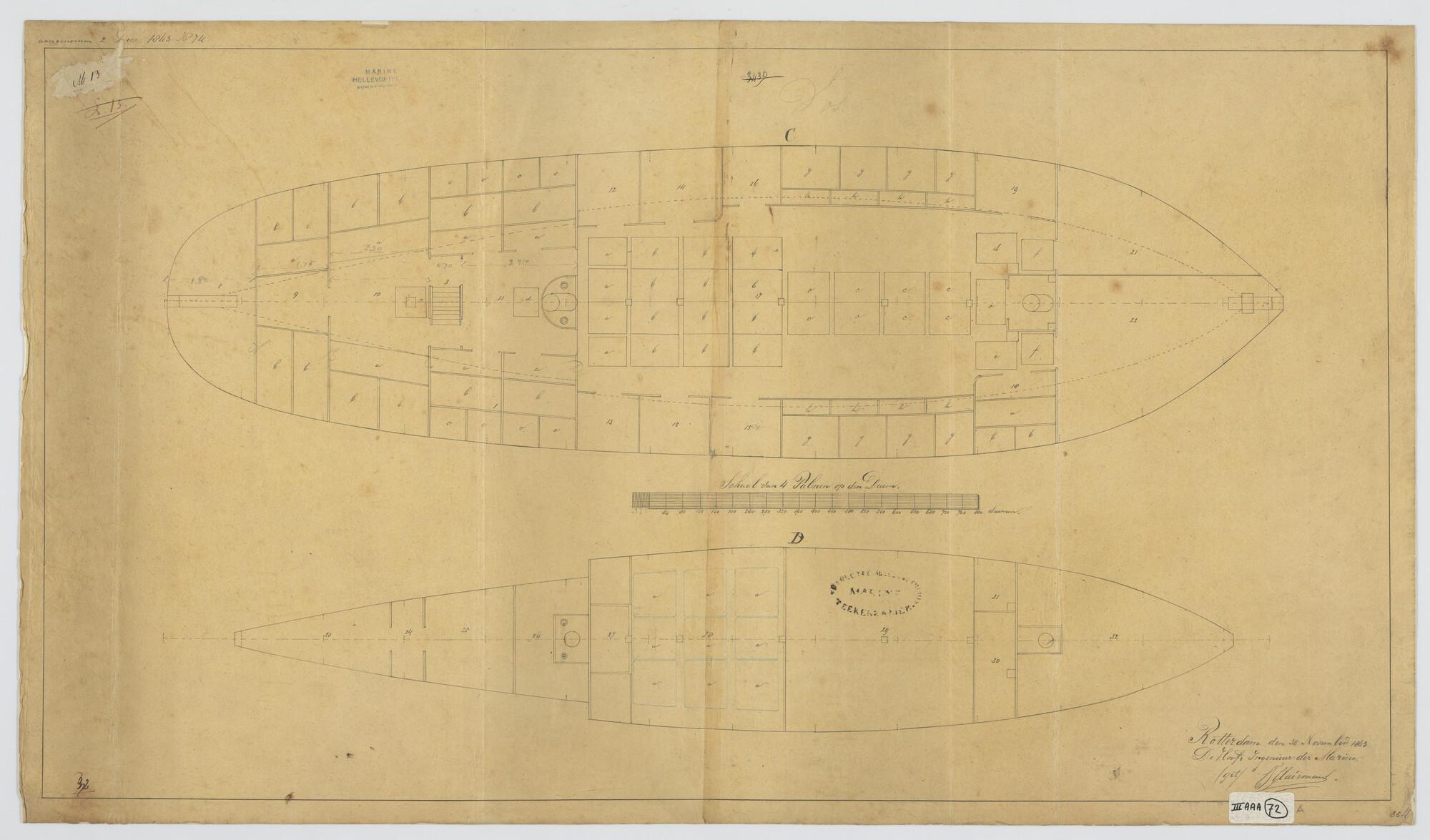 bovenaanzicht en indeling ruim van de schoeners Zr.Ms. 'Vos' en 'Wesp'.