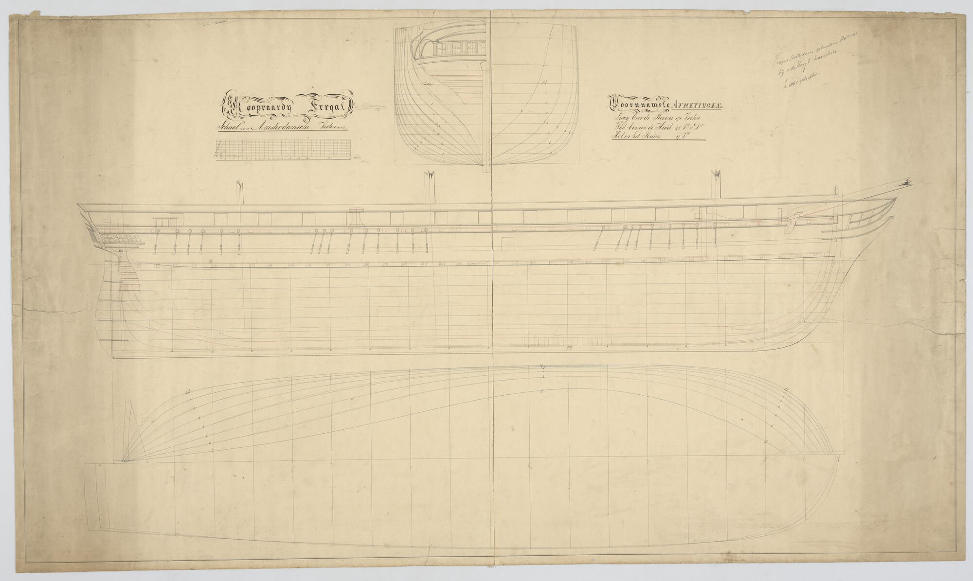 Zijaanzicht, spantenraam, met spiegel, waterlijnen van het koopvaardijfregat 'Rotterdam'. Afmetingen van het schip 170 x 42.8 x 27 voeten.