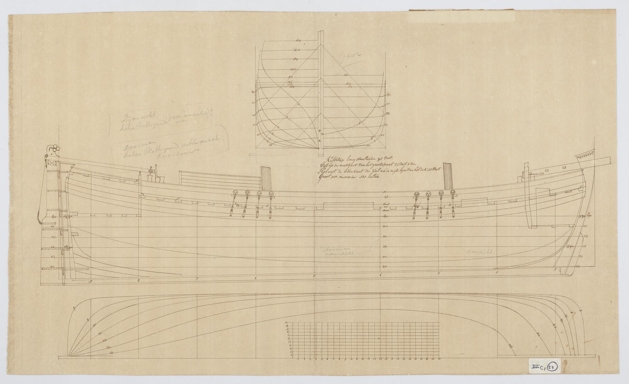 Zijaanzicht, waterlijnen, spantenraam van een kofschip Lang 92 voet.
