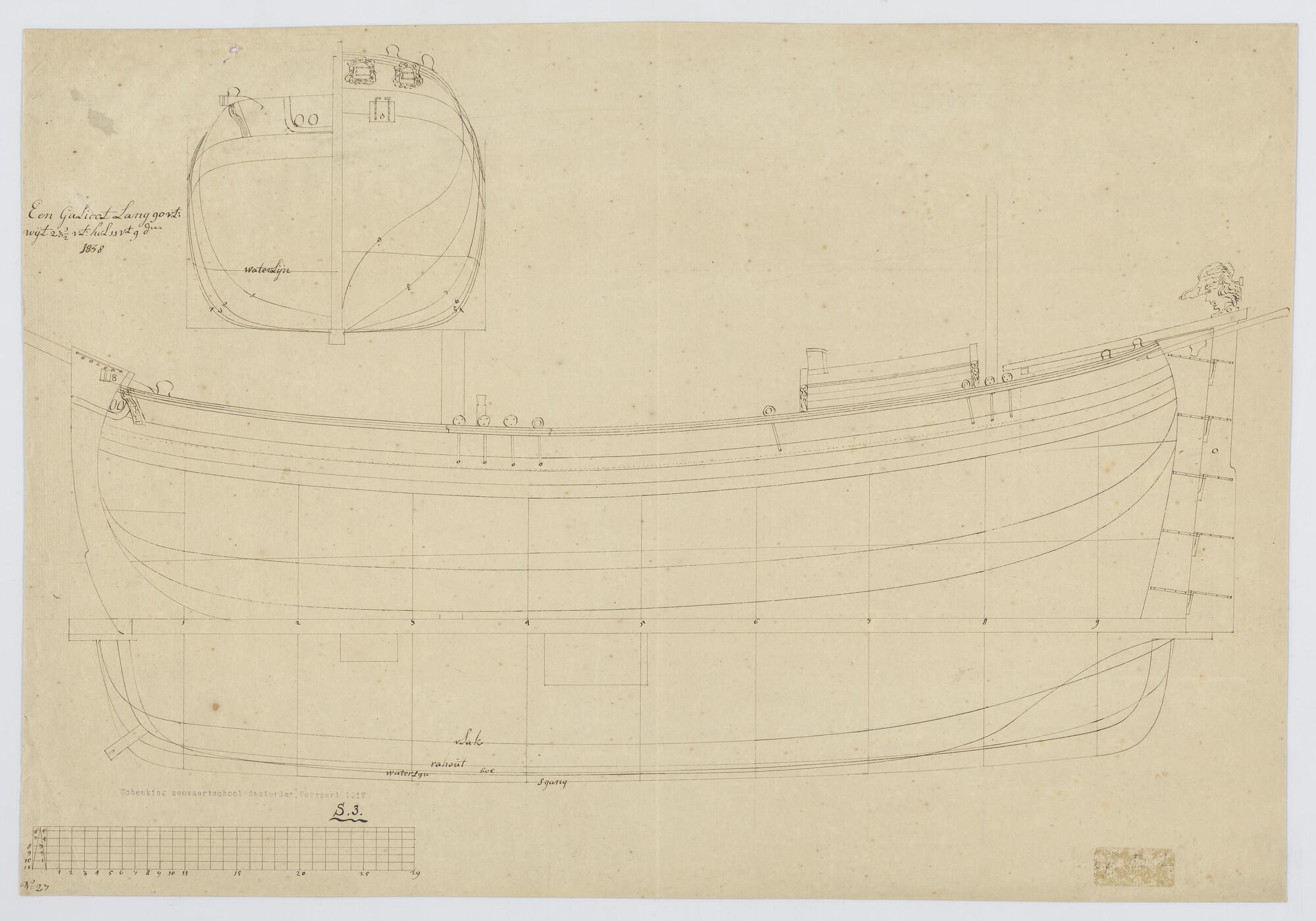 Zijaanzicht, vooraanzicht, achteraanzicht, waterlijnen van een tweemast galjoot, 1838. Lengte 90 voet.