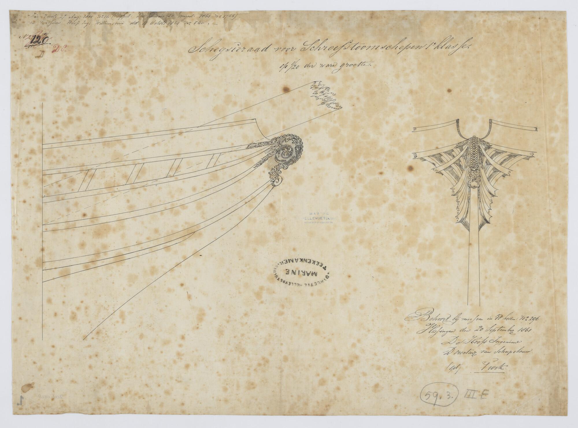Schegversiering, voorstellende een met bladranken versierde schegkrul voor schroefstoomschepen 1e klasse.