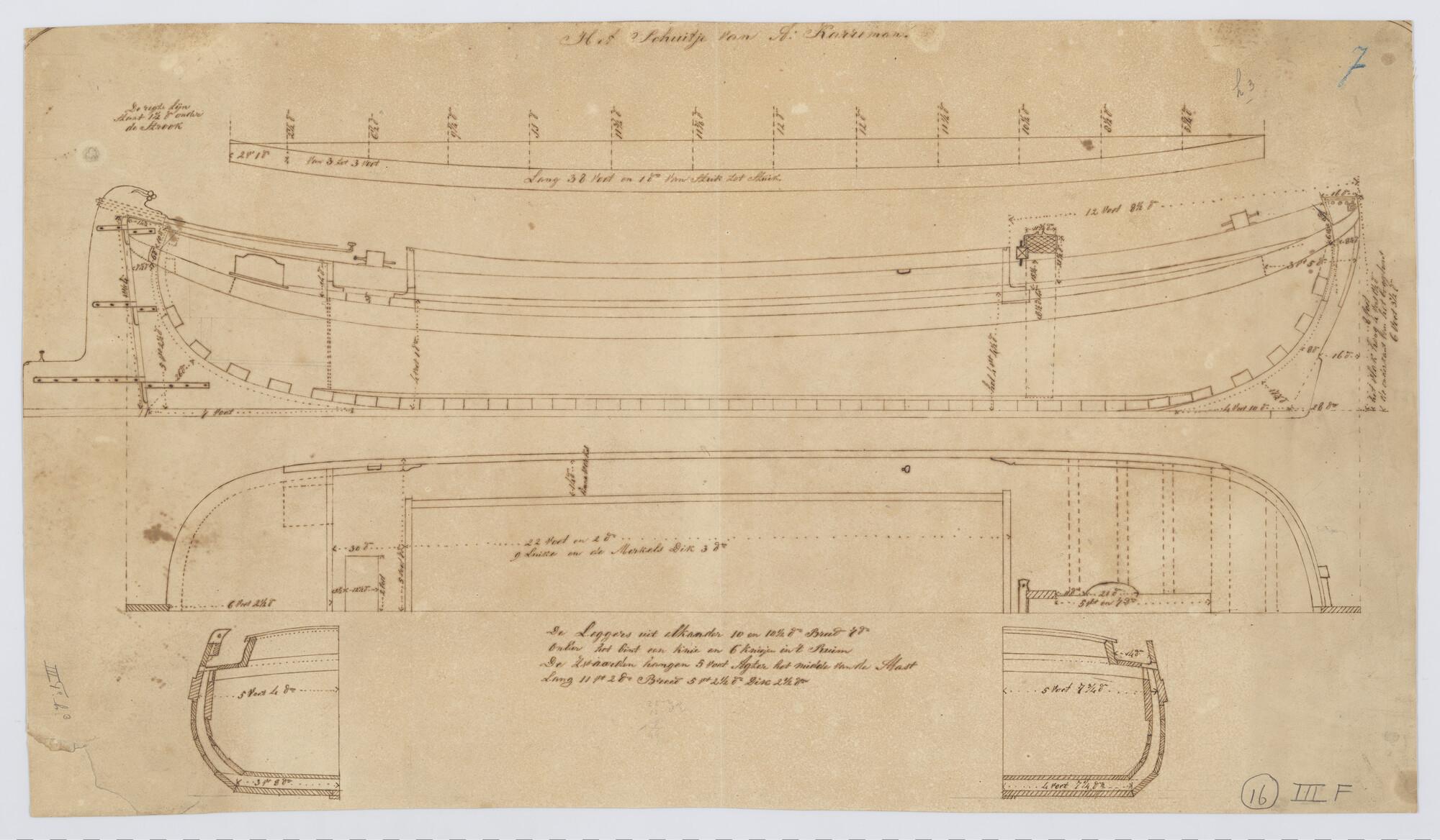 Opengewerkt zijaanzicht, bovenaanzicht, dwarsdoorsneden van een veerschuit. Lang 38 voet 1 duim.
