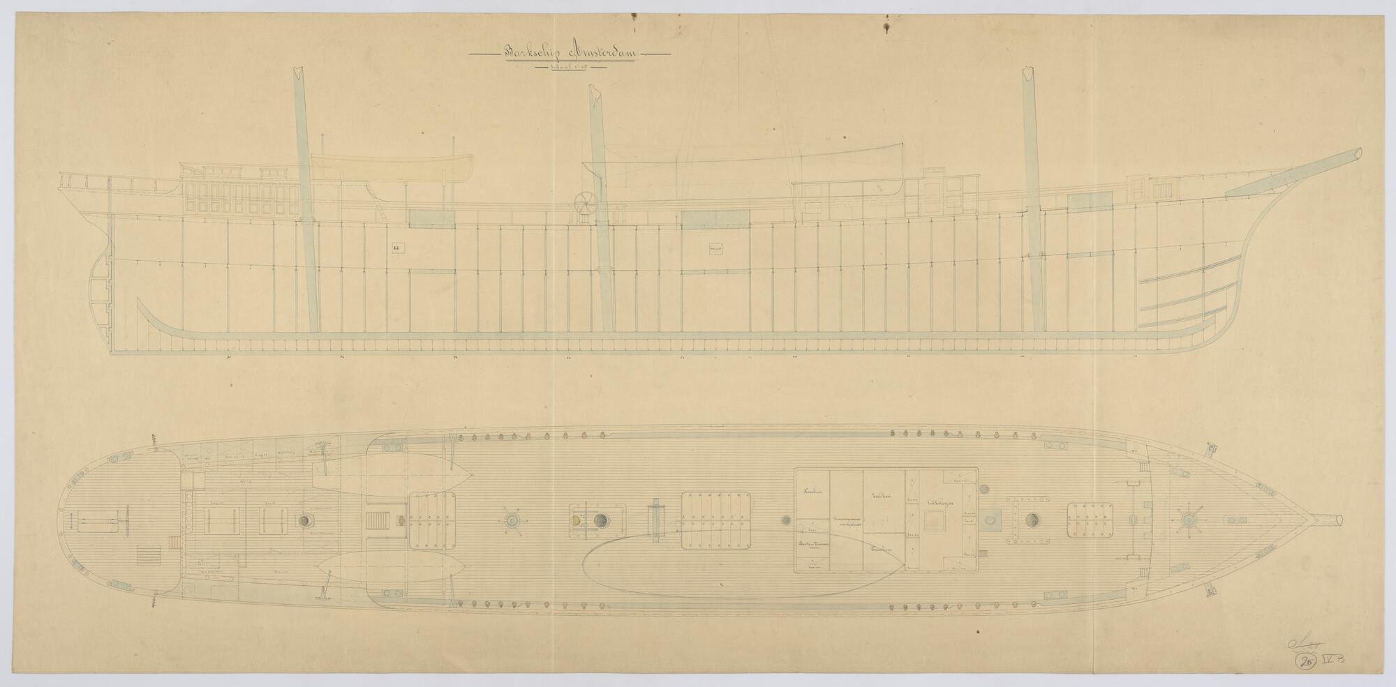 Verticale langsdoorsnede en bovenaanzicht van het stalen barkschip 'Amsterdam'.