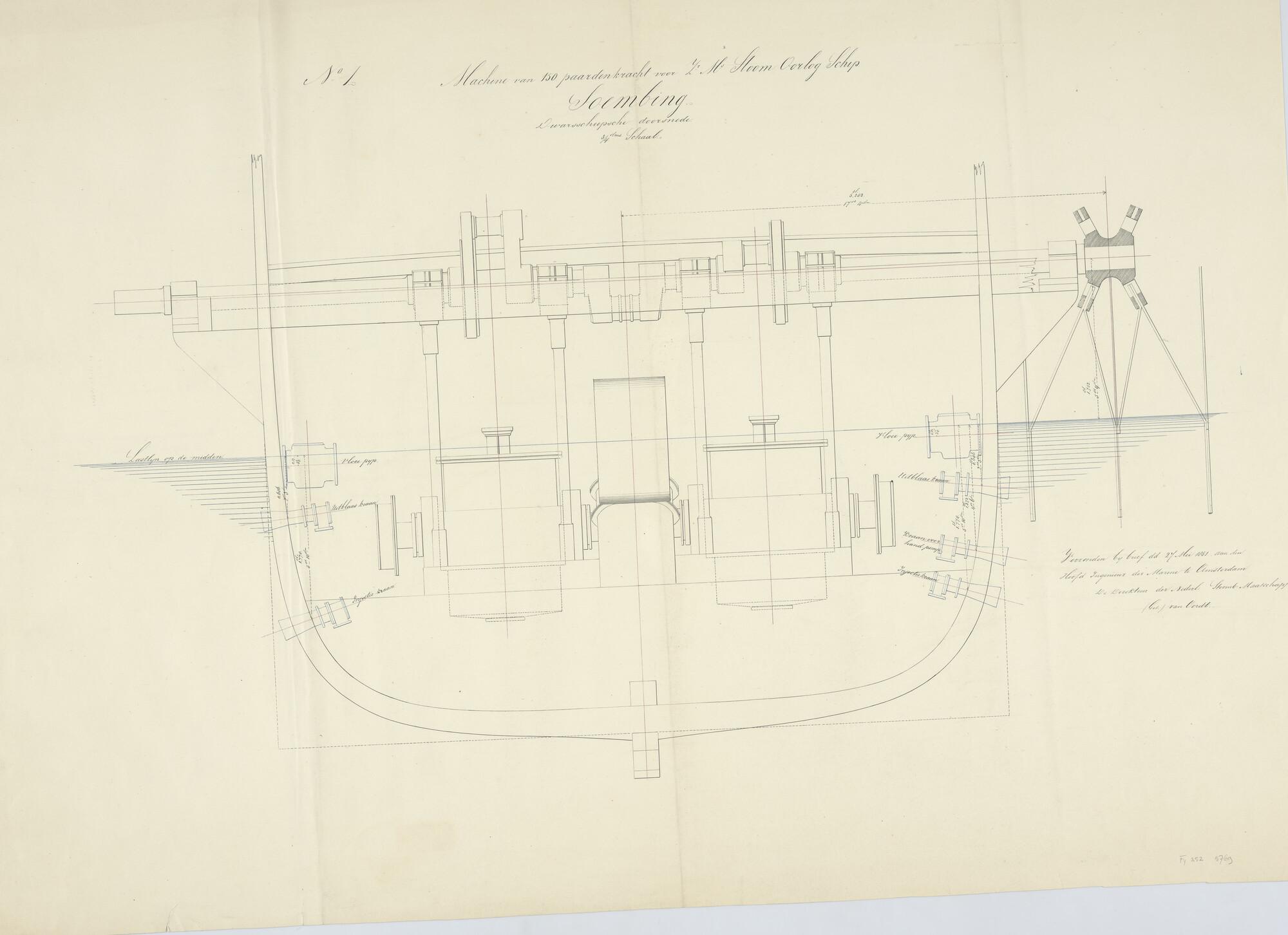 Zr.Ms. "Sindoro" en "Soembing", 1850. 45 x 8 x 5.20 ellen. Doorsnede over as met buitenboord lagerstoel.