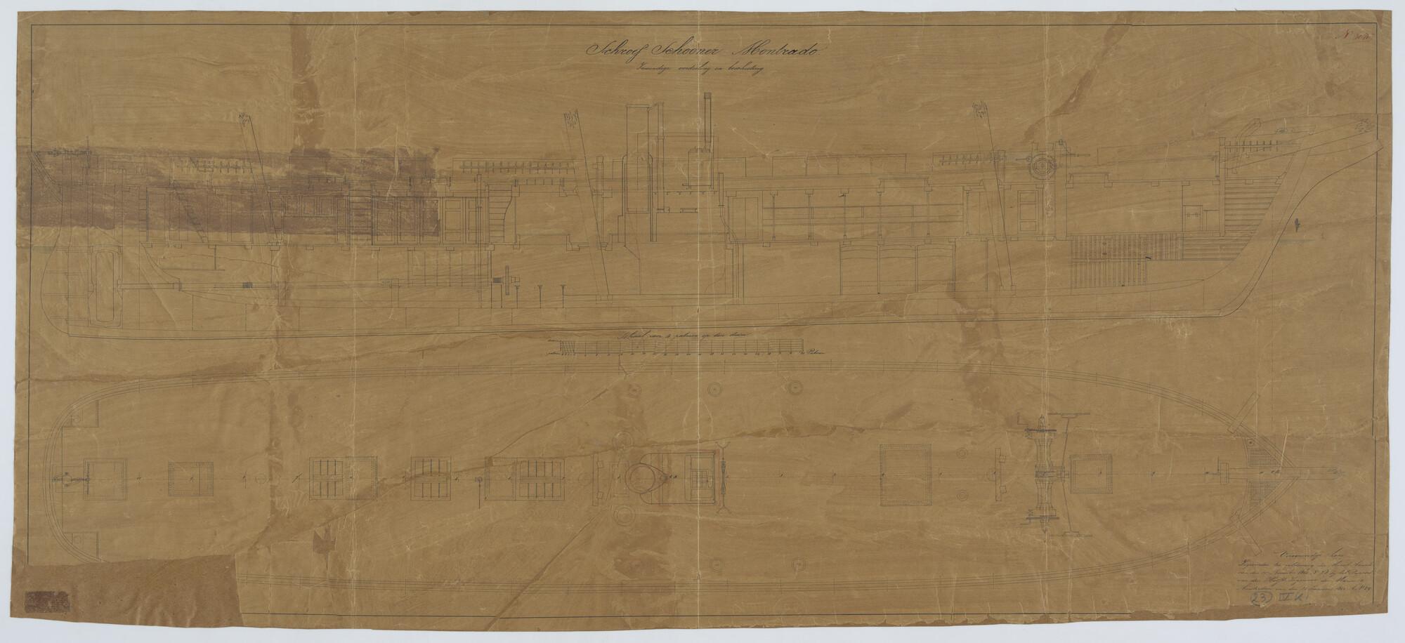 Schoener met stoomvermogen Zr.Ms. "Montrado", 1853 - 1854. Verticale langsdoorsnede en opperdek.