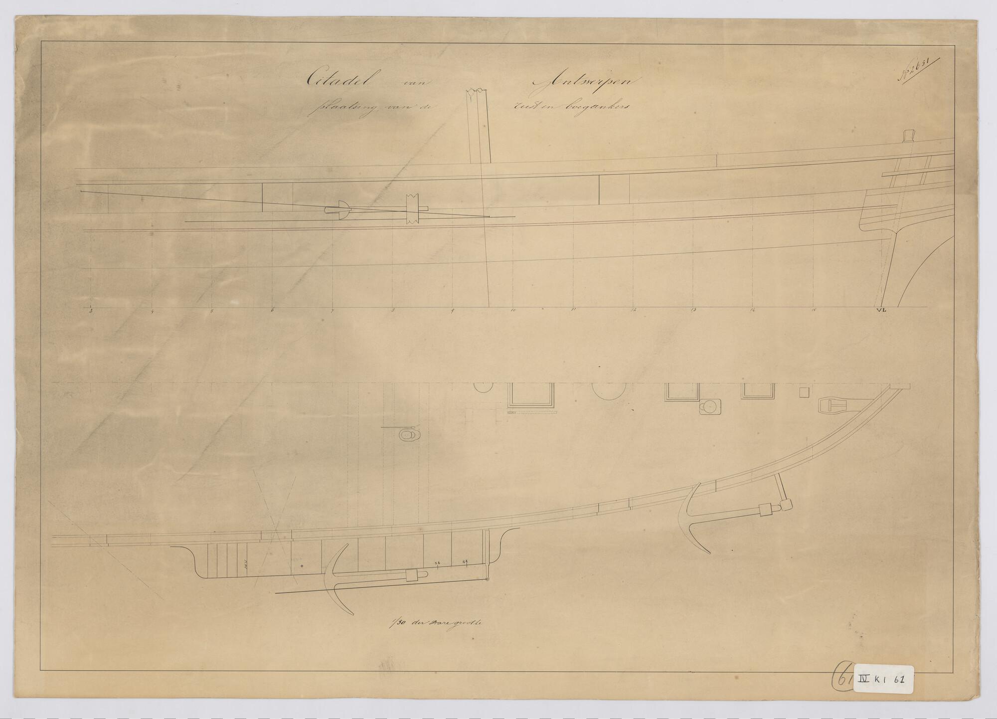 Het schroefstoomschip 2de klasse Zr.Ms. "Citadel van Antwerpen", 1856. Plaatsing rust- en boegankers.