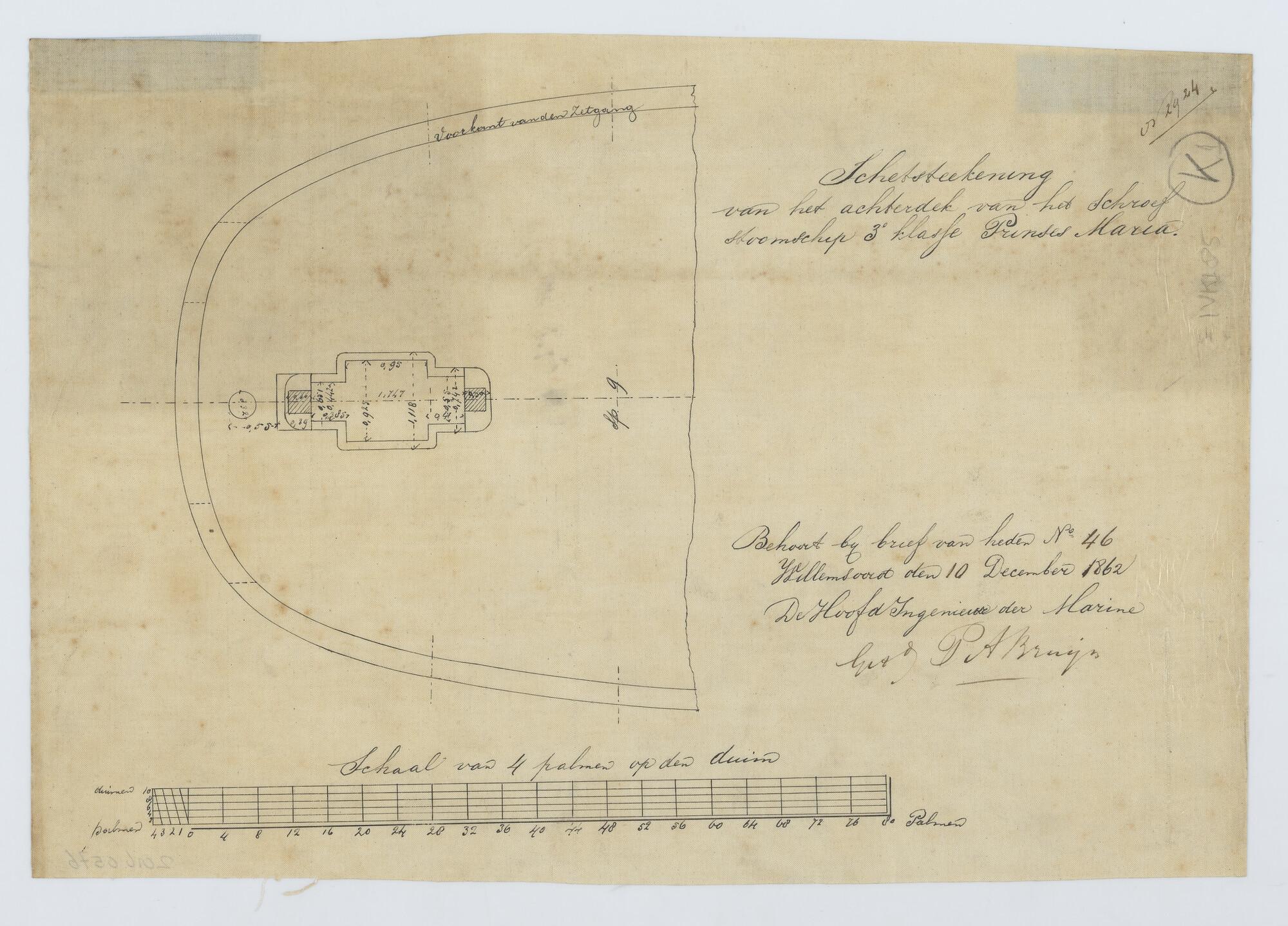 Het schroefstoomschip 3de klasse Zr.Ms. "Prinses Maria", 1858. 46.68 x 9 x 4.80 ellen. Schroefgat.