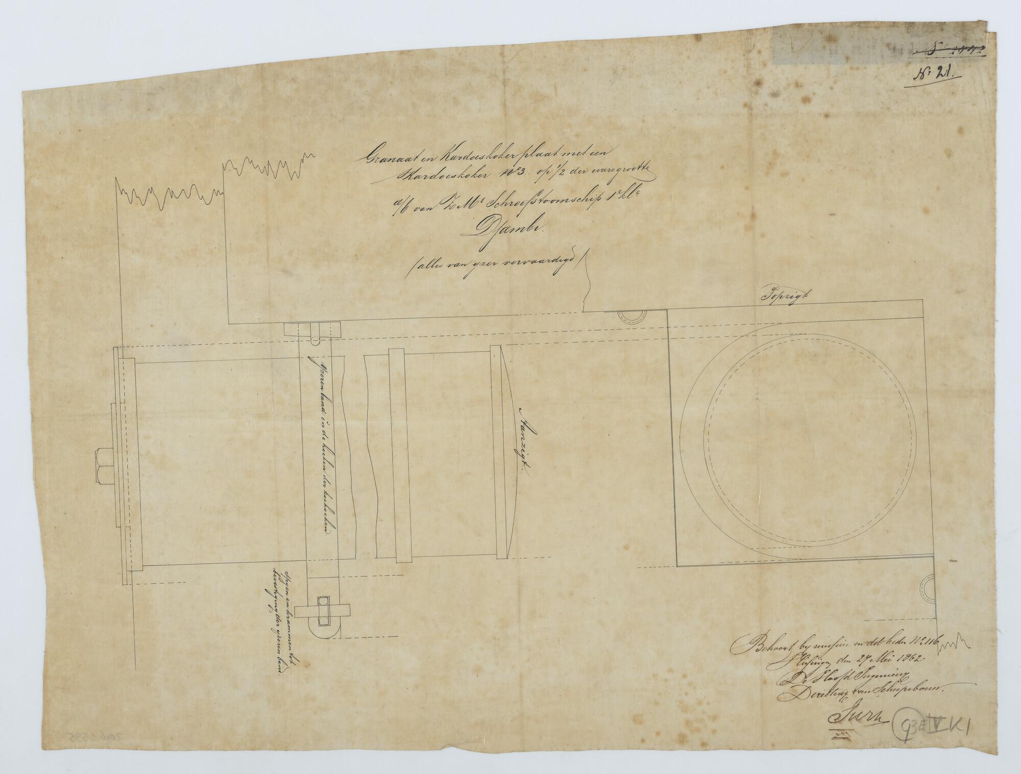Het schroefstoomschip 1ste klasse Zr.Ms. "Djambi", 1858. Detailtekeningen.