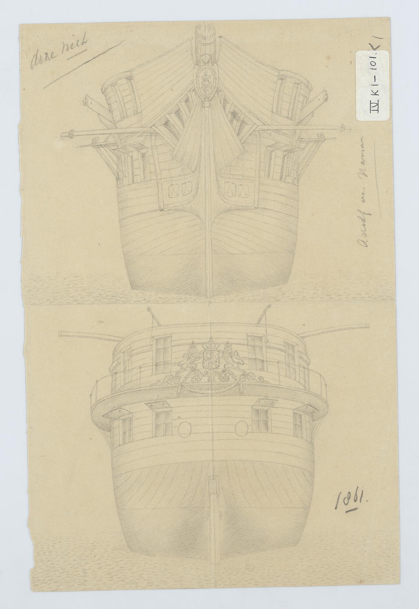 Het fregat met stoomvermogen 1ste klasse Zr.Ms. "Adolf van Nassau", 1858. Boeg en spiegelversiering 1861.