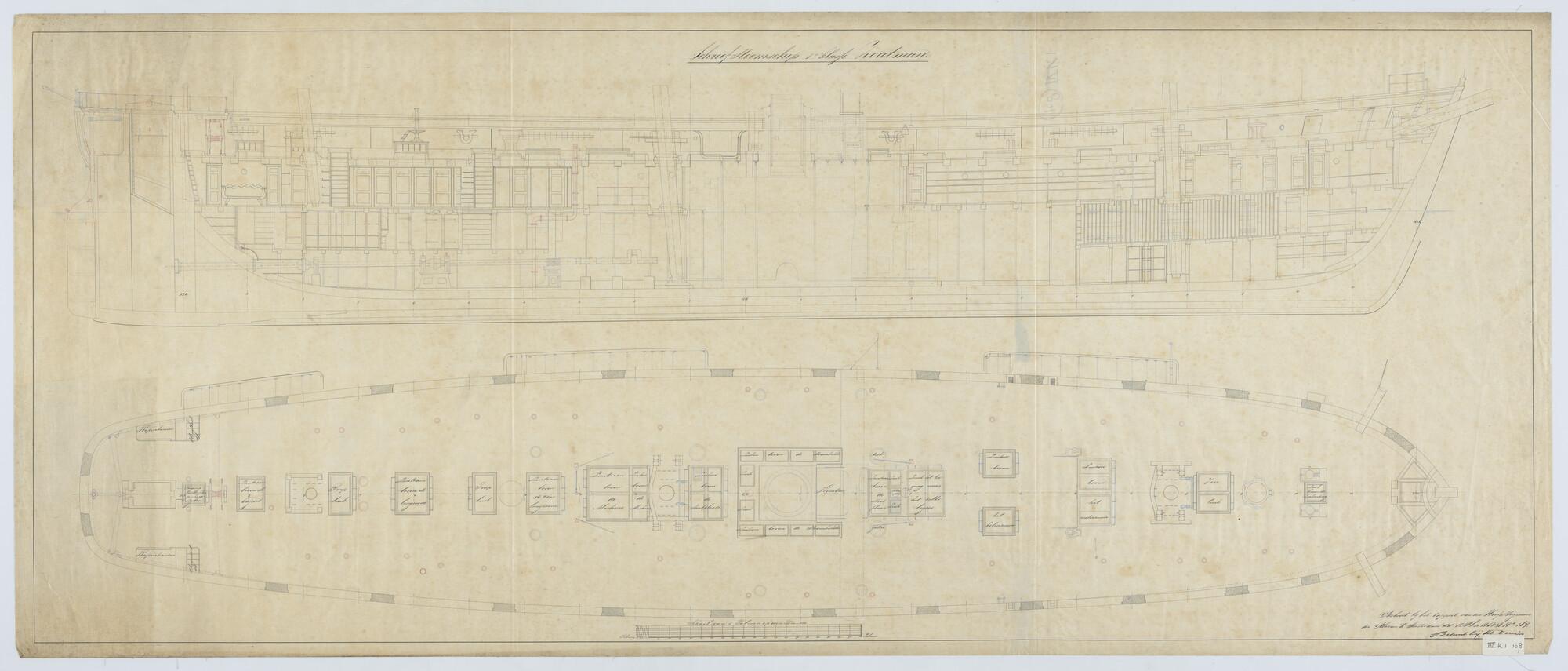 Schroefstoomschip 1ste klasse Zr.Ms. "Zoutman", 1859. verticale langsdoorsnede, bovendek.