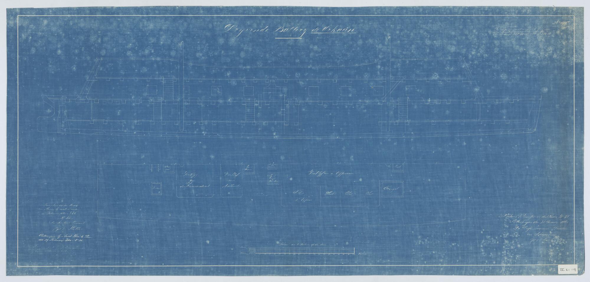 De drijvende batterij "Orkaan", 1859. Verticale langsdoorsnede en beschieting van de officiersaccommodatie.