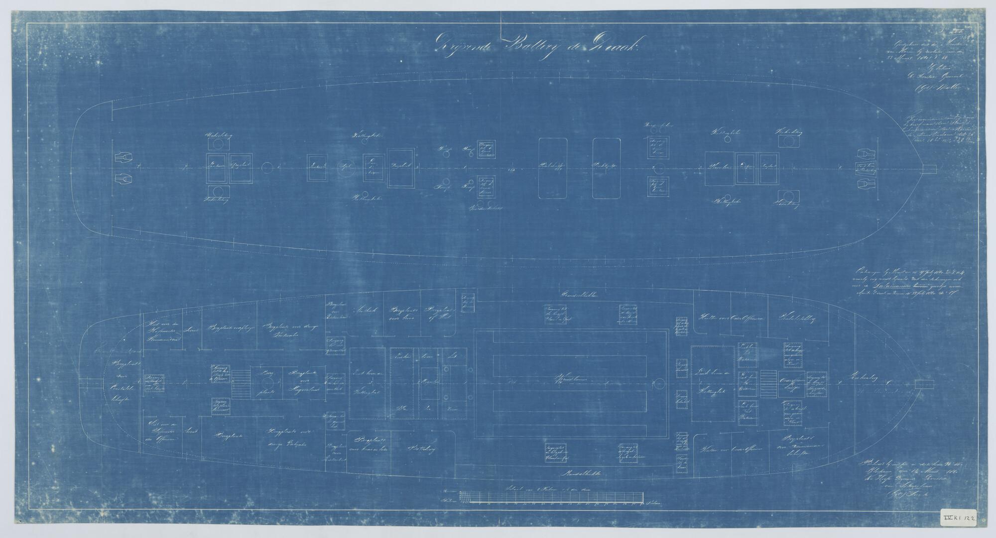 Drijvende batterij "Draak", 1859 (ex- fregat Zr.Ms. "Ceres", 1820) tussendek. verticale langsdoorsnede, horizontale langsdoorsnede.
