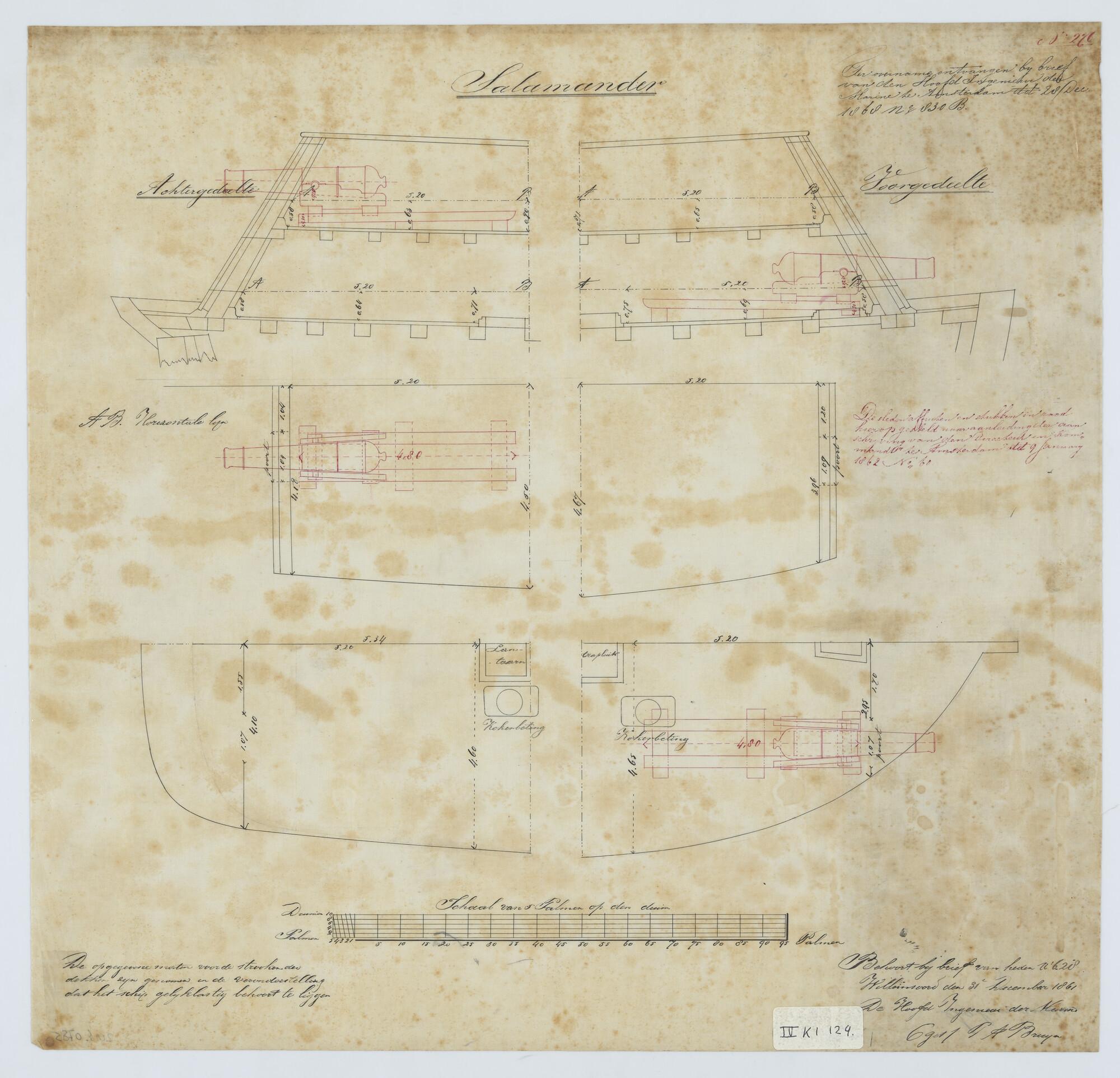 Drijvende batterij "Salamander, 1859 (ex- Zr.Ms. Prins Frederik"). Voor- en achtergedeelte.