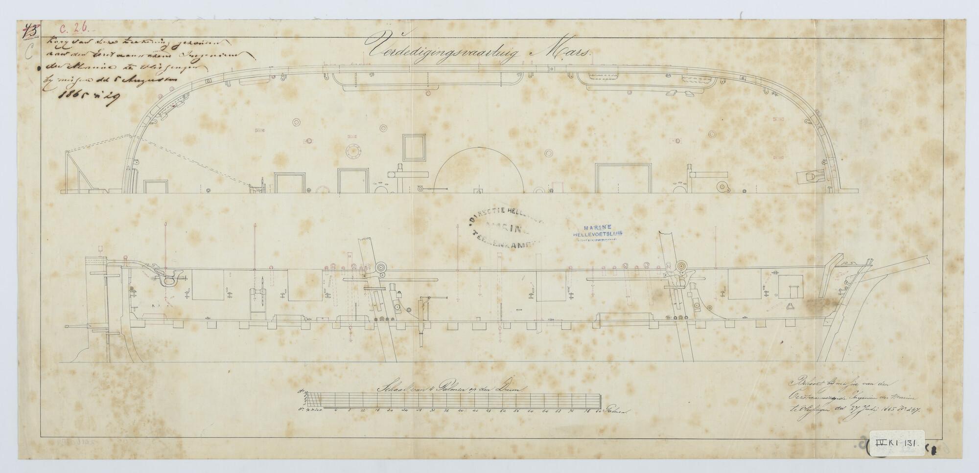Het verdedigingsvaartuig Zr.Ms. "Mars", 1859. verticale langsdoorsnede, bovenaanzicht.