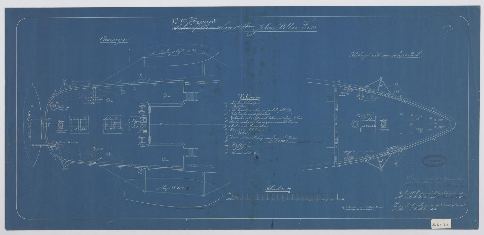 Het schroefstoomschip 1ste klasse Zr.Ms. "Johan Willem Friso", 1883. Bovenaanzicht bak en kampagne.