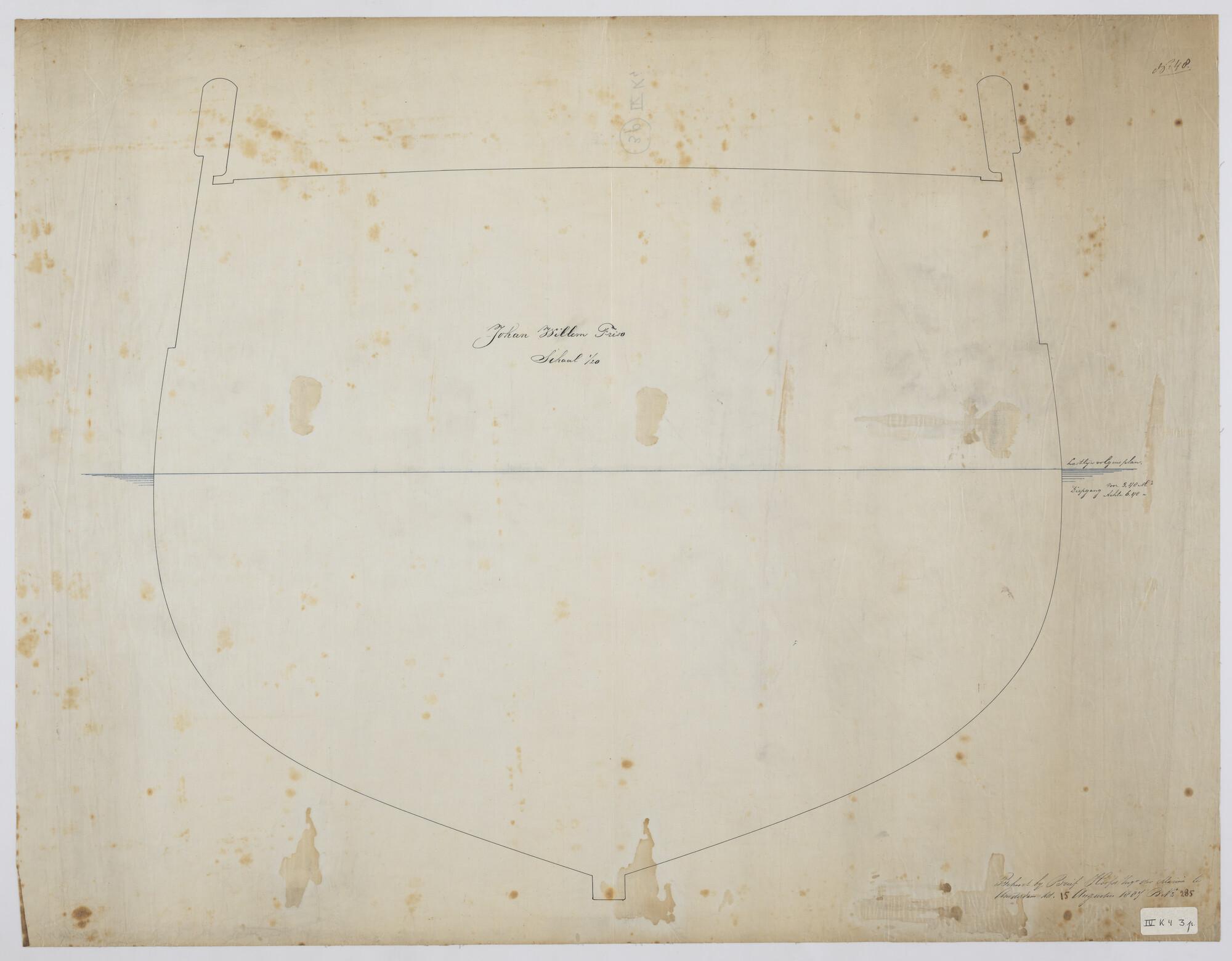Het schroefstoomschip 1ste klasse Zr.Ms. "Johan Willem Friso", 1883. dwarsdoorsnede schip omtrek met lastlijn.