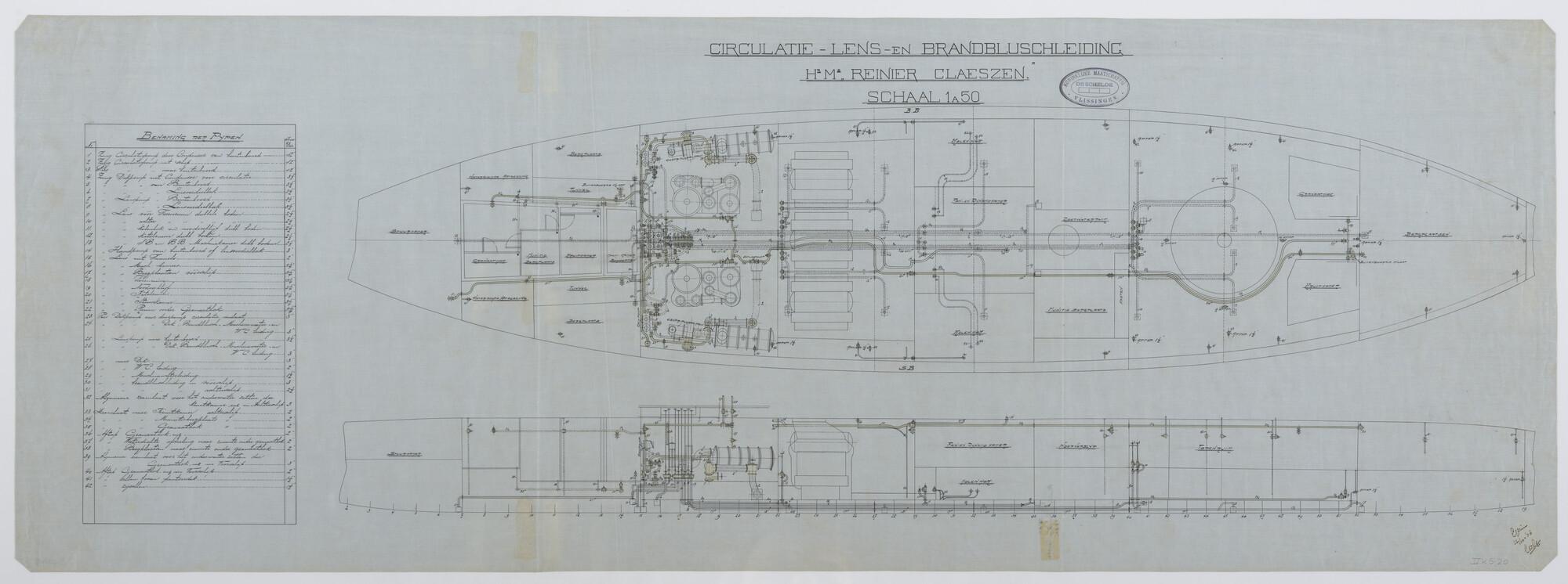 De monitor Zr.Ms. "Reinier Claeszen", 1890. Circulatie-, lens-, en brandblusleiding.