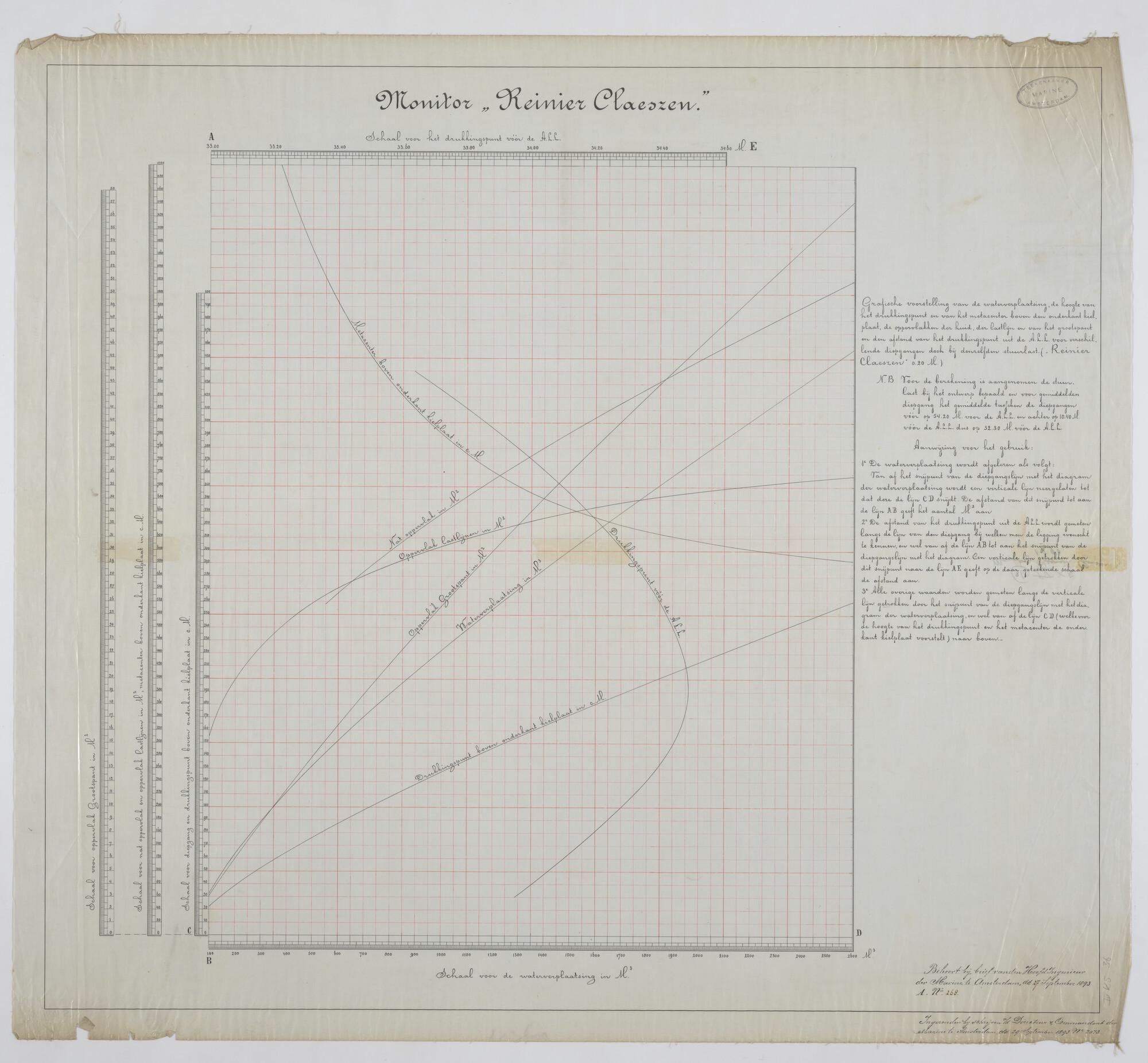 De monitor Zr.Ms. "Reinier Claeszen", 1890. Grafiek van metacenter hoogte, waterverplaatsing drukkingspunt etc.