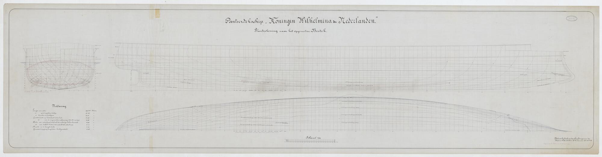 Het pantserdektorenschip Hr.Ms. "Koningin Wilhelmina der Nederlanden", 1892. spantenraam, waterlijnen, verticalen.
