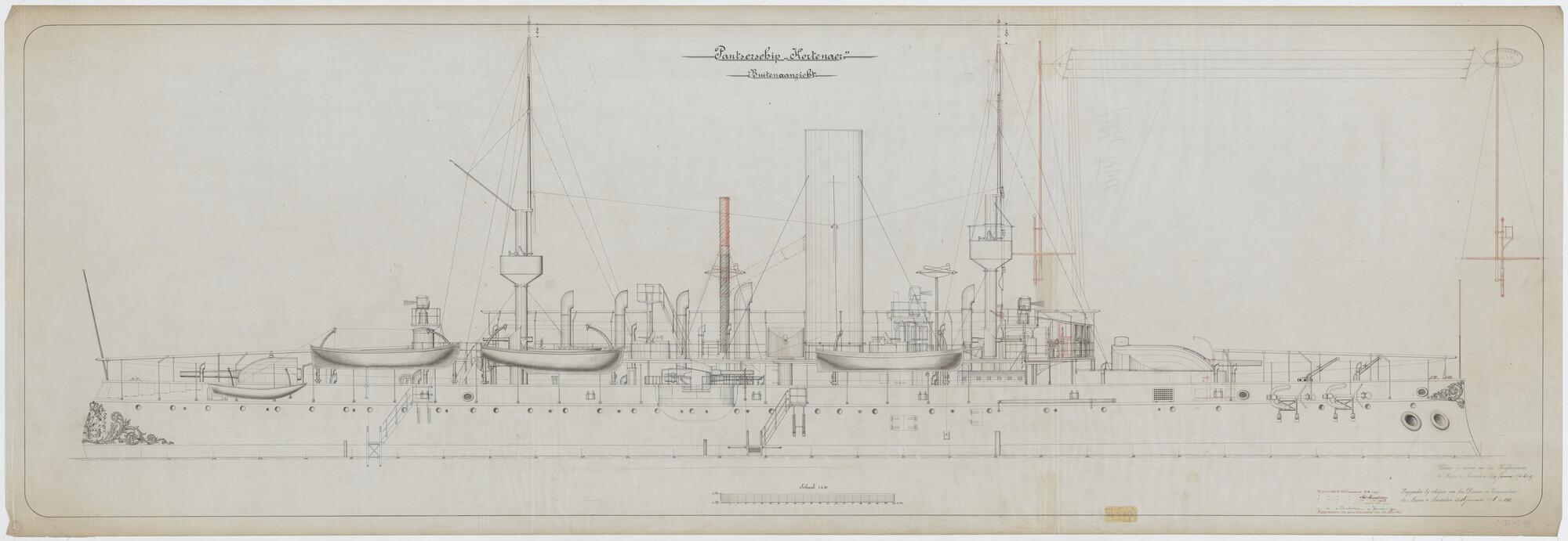 Het pantserschip Hr.Ms. "Kortenaer", 1893. zijaanzicht van het schip.