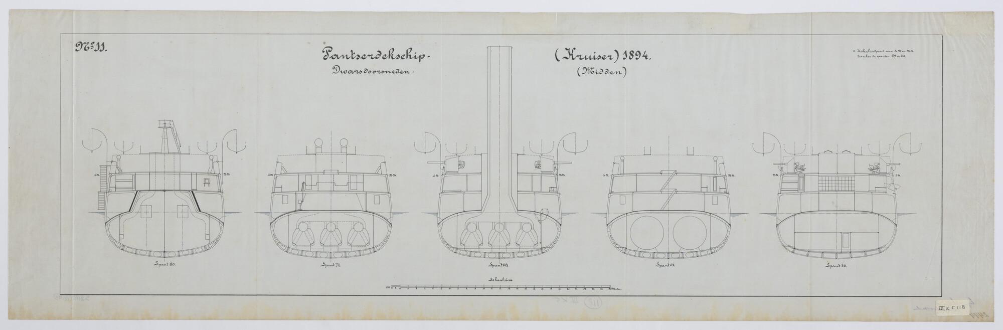 Het pantserdekschip Hr.Ms. "Holland", 1894. dwarsdoorsnede op spant 56, 62, 68, 74 en 80.