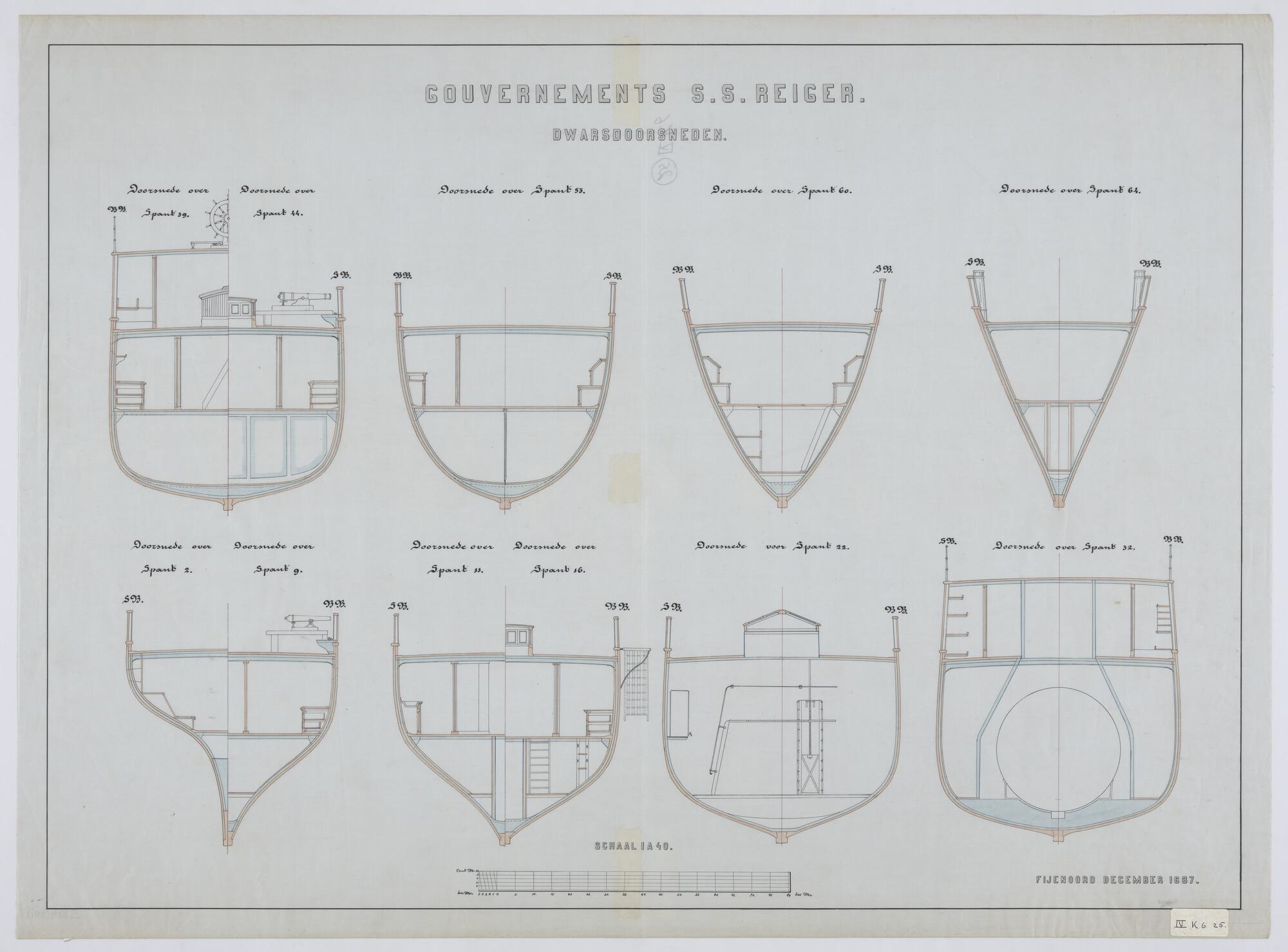 Het schroefstoomschip Zr.Ms. "Reiger", 1887. dwarsdoorsnede op spant 2, 9, 11, 16, 22, 32, 39, 44, 53, 60, 64.