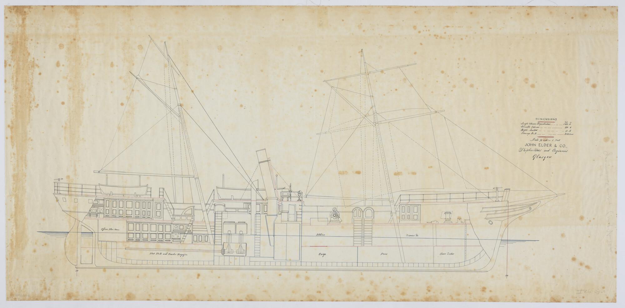 Het schroefstoomschip Zr.Ms. "Havik" en "Zeemeeuw", 1878. verticale langsdoorsnede, tuigtekening.