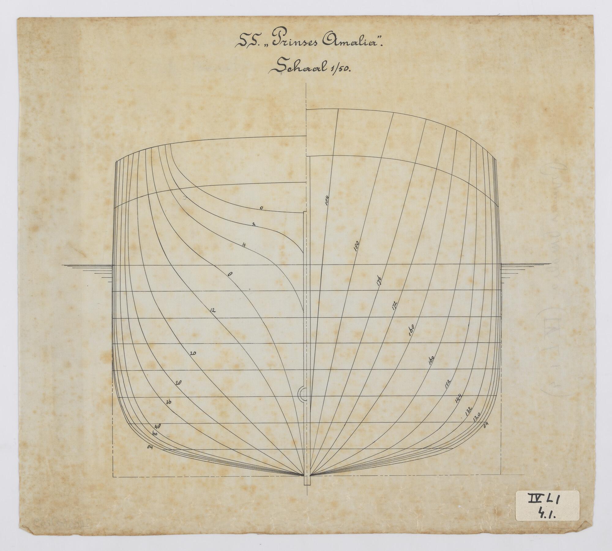 Zijaanzicht, waterlijnen, verticalen en spantenraam van het schroefstoomschip Prinses Amalia, 1874