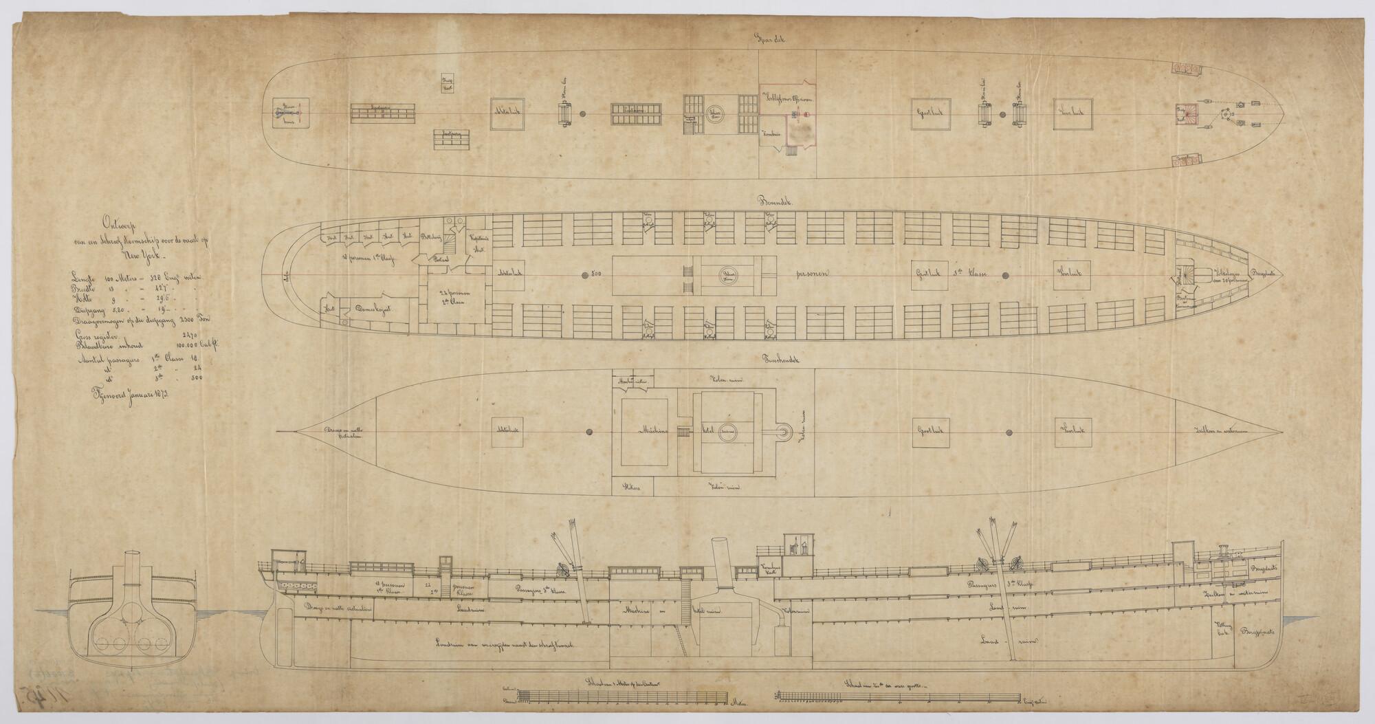 Verticale langsdoorsnede, grootspant, spardek, bovendek en tussendek van het ss. "County of Sutherland". Schroefstoomschip voor de vaart op New York 1873, afmetingen 328 x 42,7 x 29.6 voet.