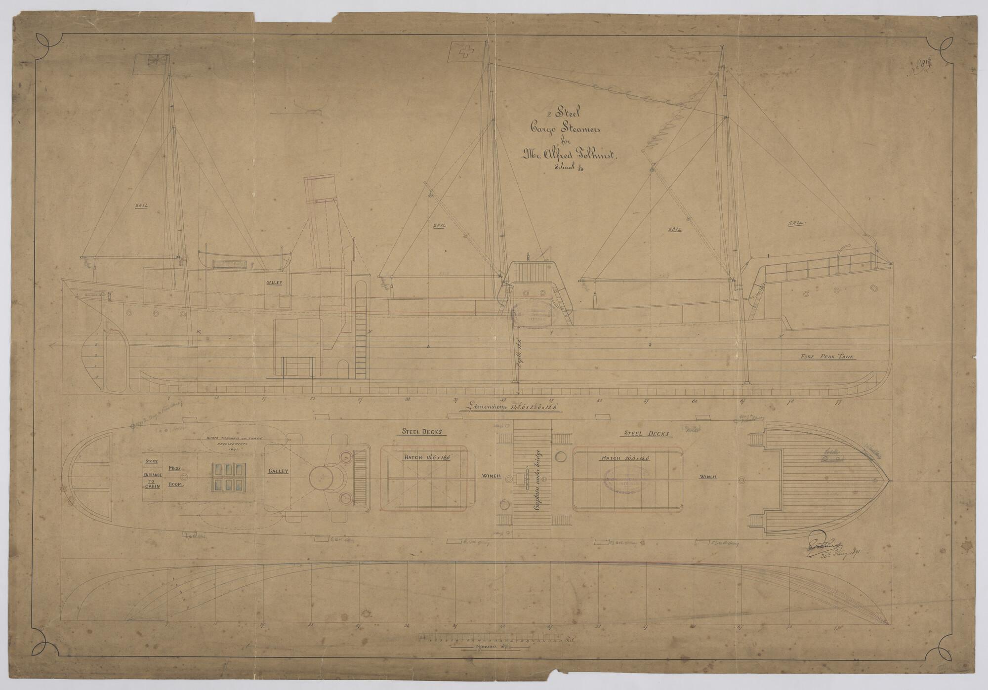 Zijaanzicht, bovenaanzicht en lijnenplan van een Steel cargo steamer 1891