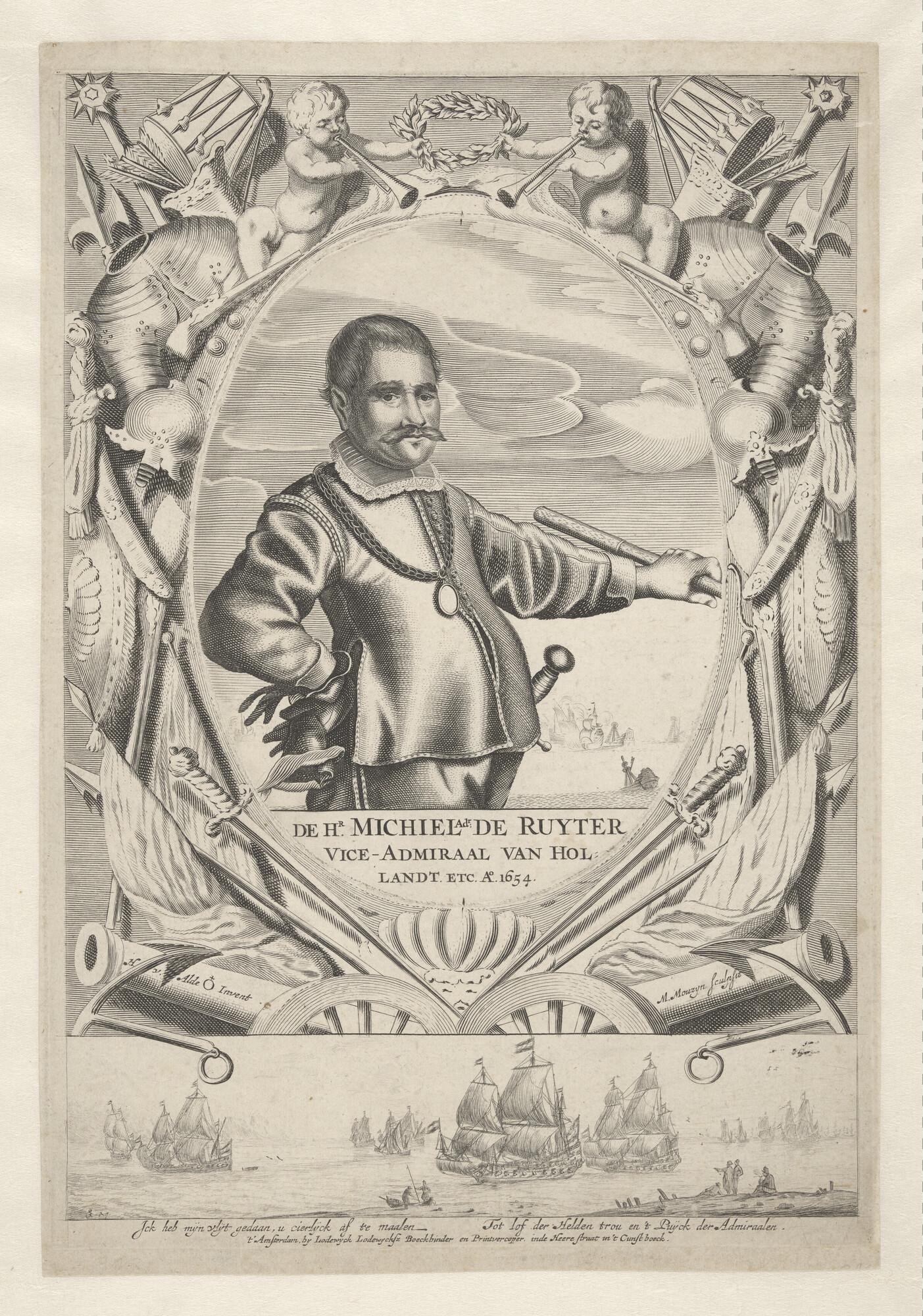 Portret van Michiel Adriaansz. de Ruyter, in een cartouche van wapentrofeeën; eronder schepen bij een kust door Reinier Nooms alias Zeeman.