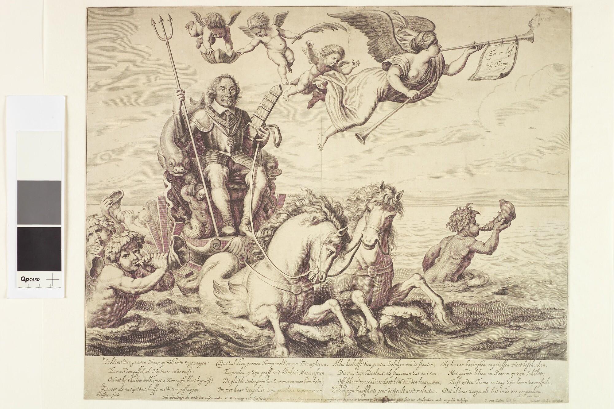 Maarten Harpertsz. Tromp verbeeld als Neptunus met drietand en anker, zittend op een versierde zegewagen. De wagen wordt door het water voortgetrokken door twee paarden en omringd door tritons met hoorns. Boven de wagen zweeft Faam met loftrompet en drie putti met een schepenkroon.