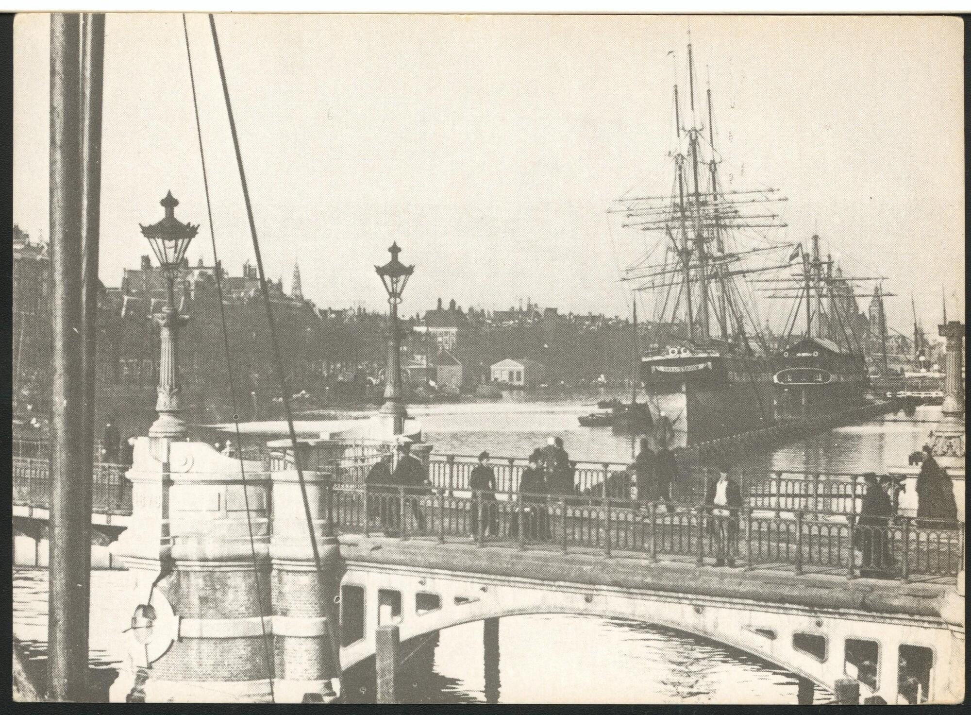 Het zeilschip "Graafstroom" van J. Smit te Alblasserdam in de IJgracht met Kattenburgerbrug met links Prins Hendrikkade in 1890. Achter het schip is het wachtschip van de marine te zien.