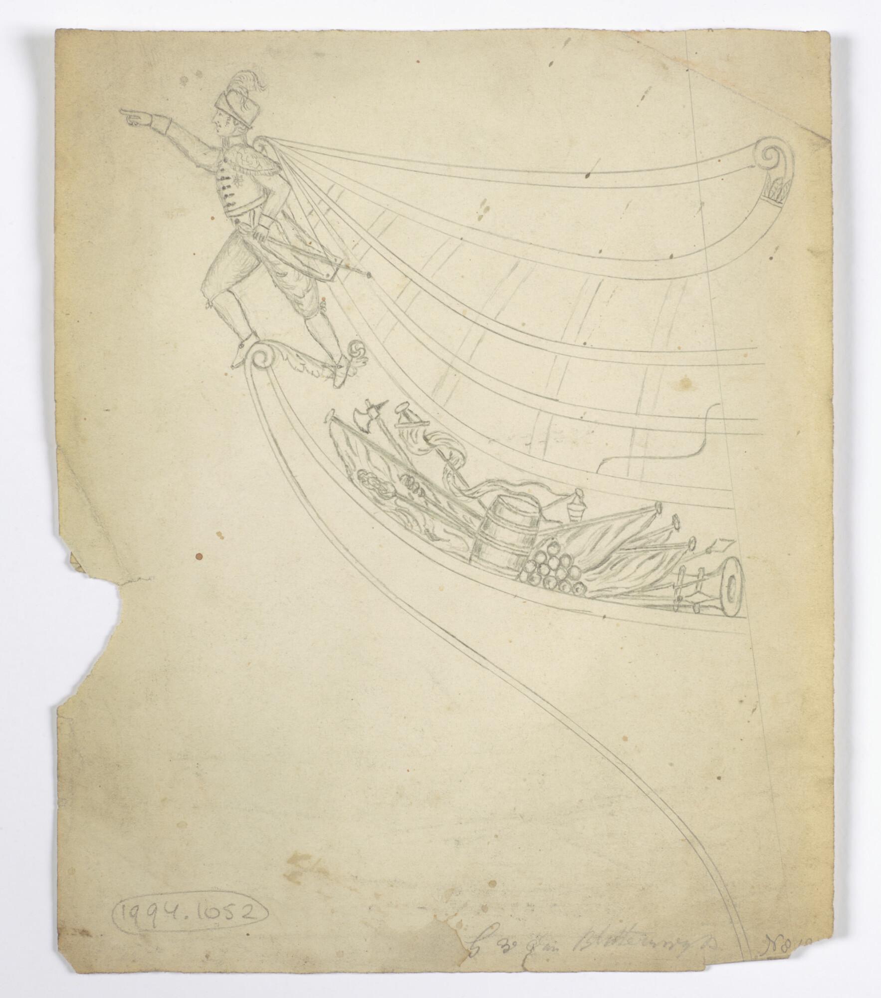 Tekening van een boegbeeld van een man in uniform, vooruit wijzend met zijn rechter wijsvinger.