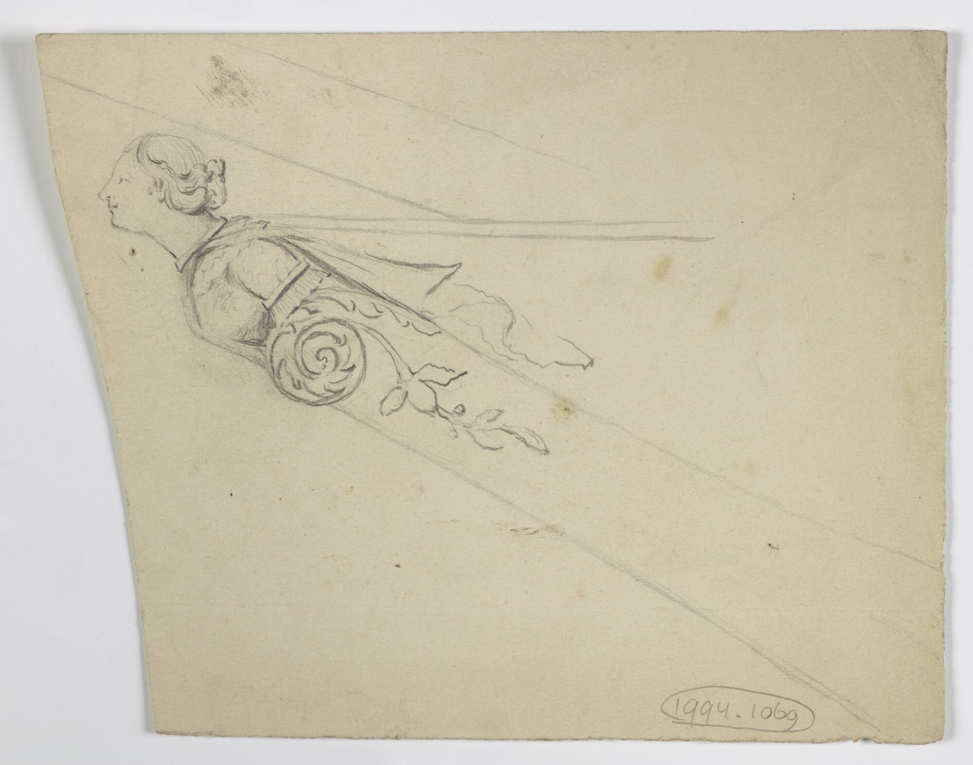 Tekening van boegbeeld met borstbeeld van een vrouw