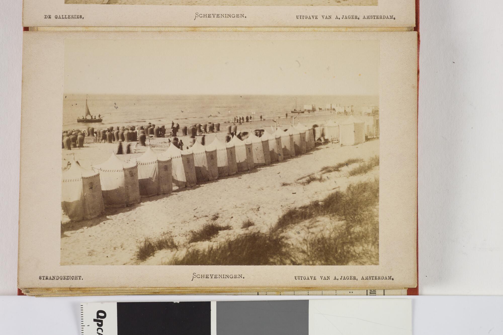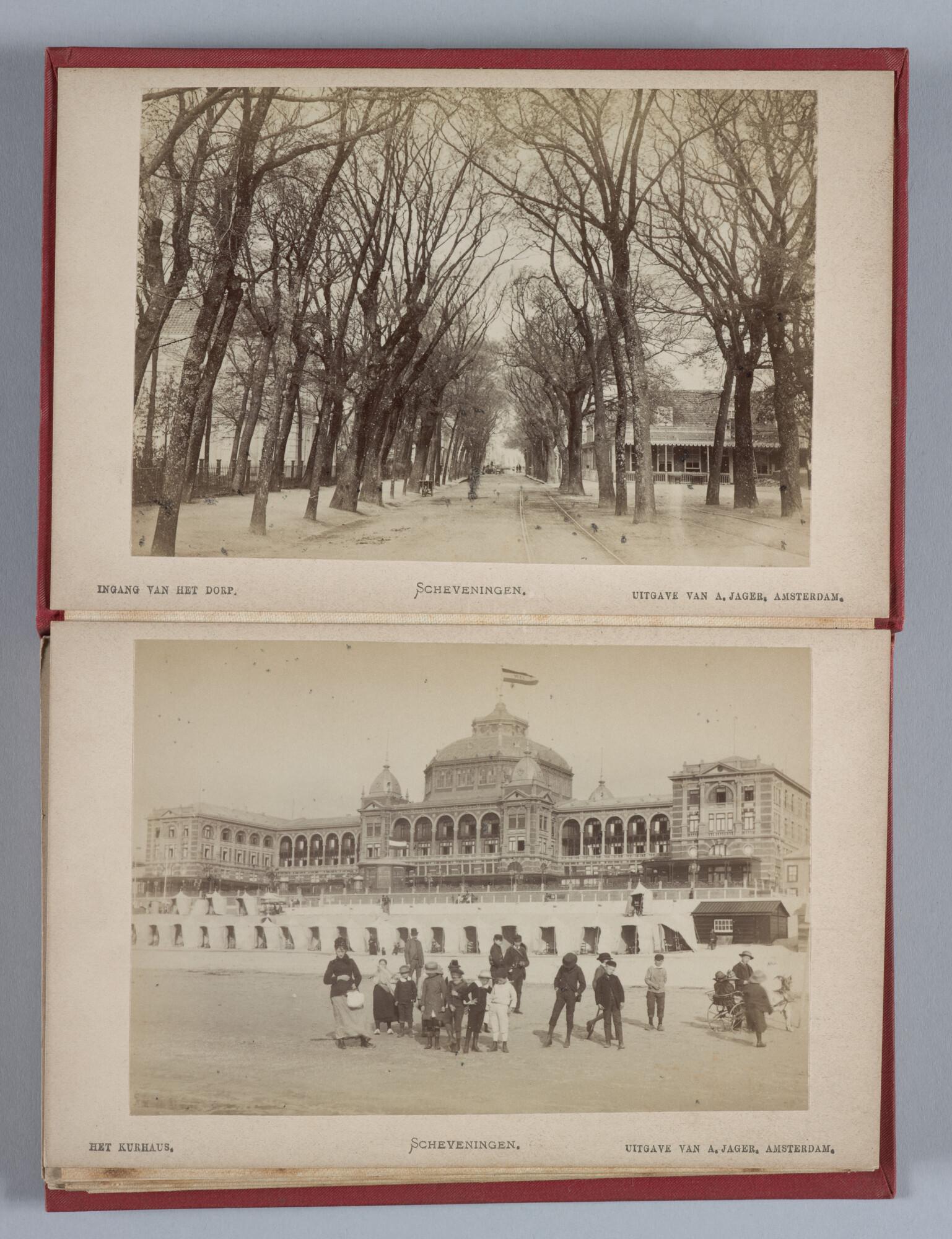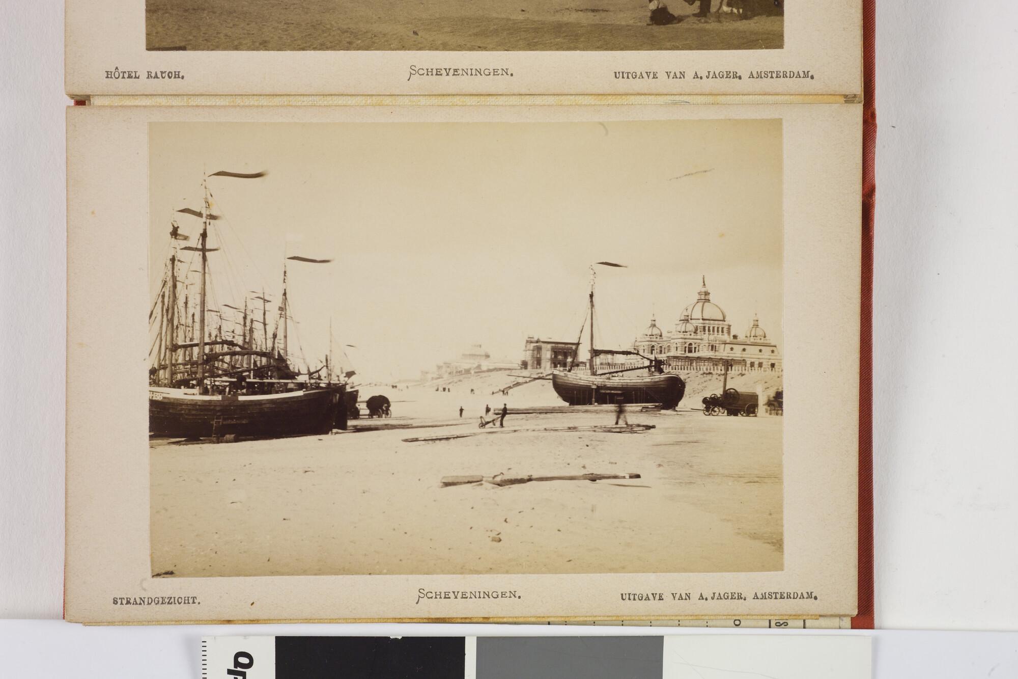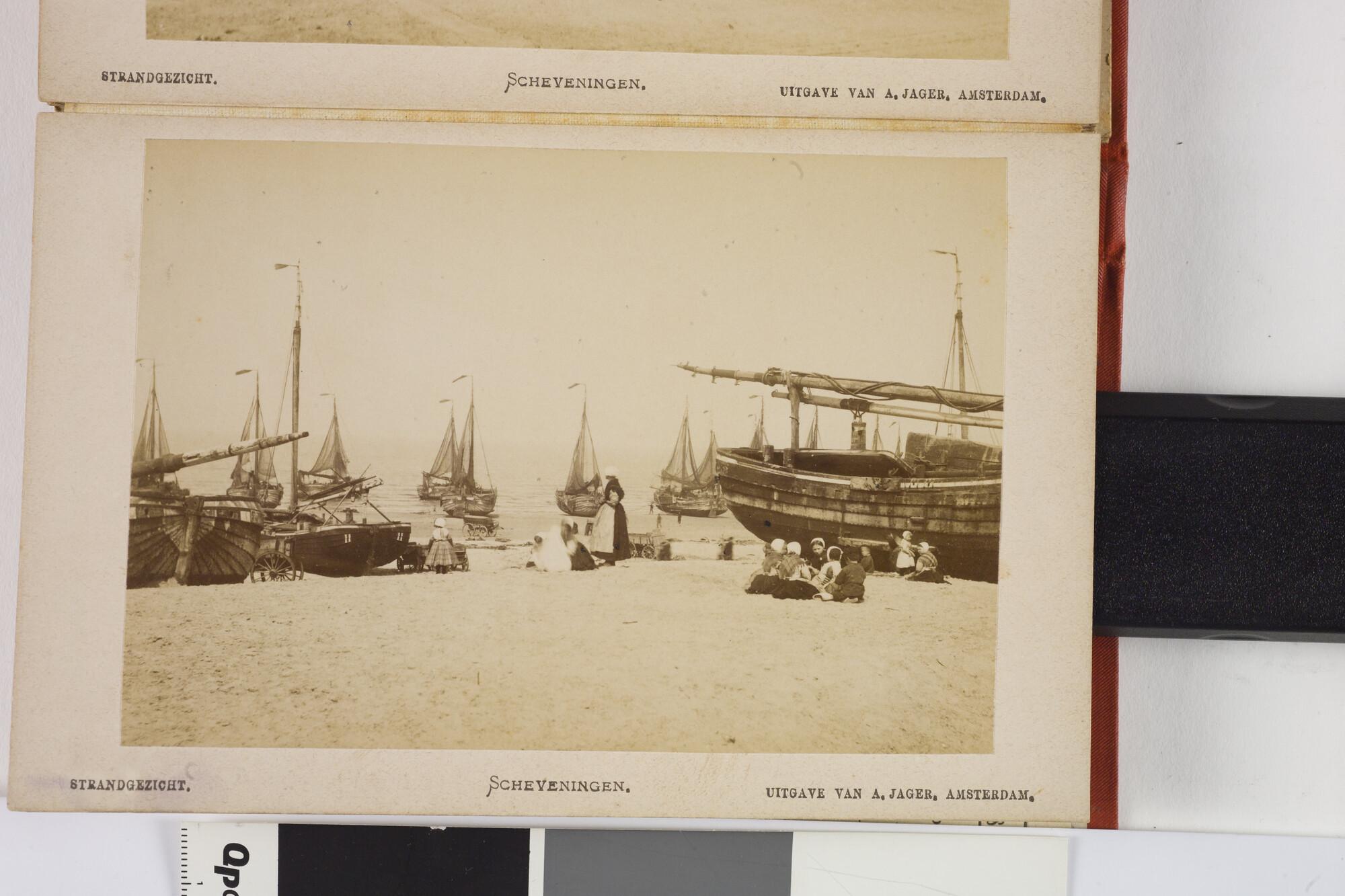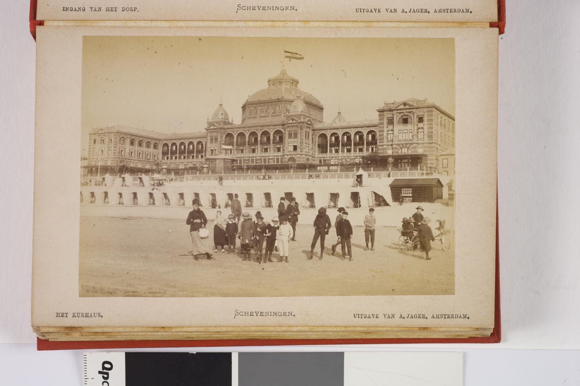 Mapje met 12 zwart-wit foto's van het dorp, het Kurhaus en het strand van Scheveningen met badgasten en vissersschepen omstreeks 1885.