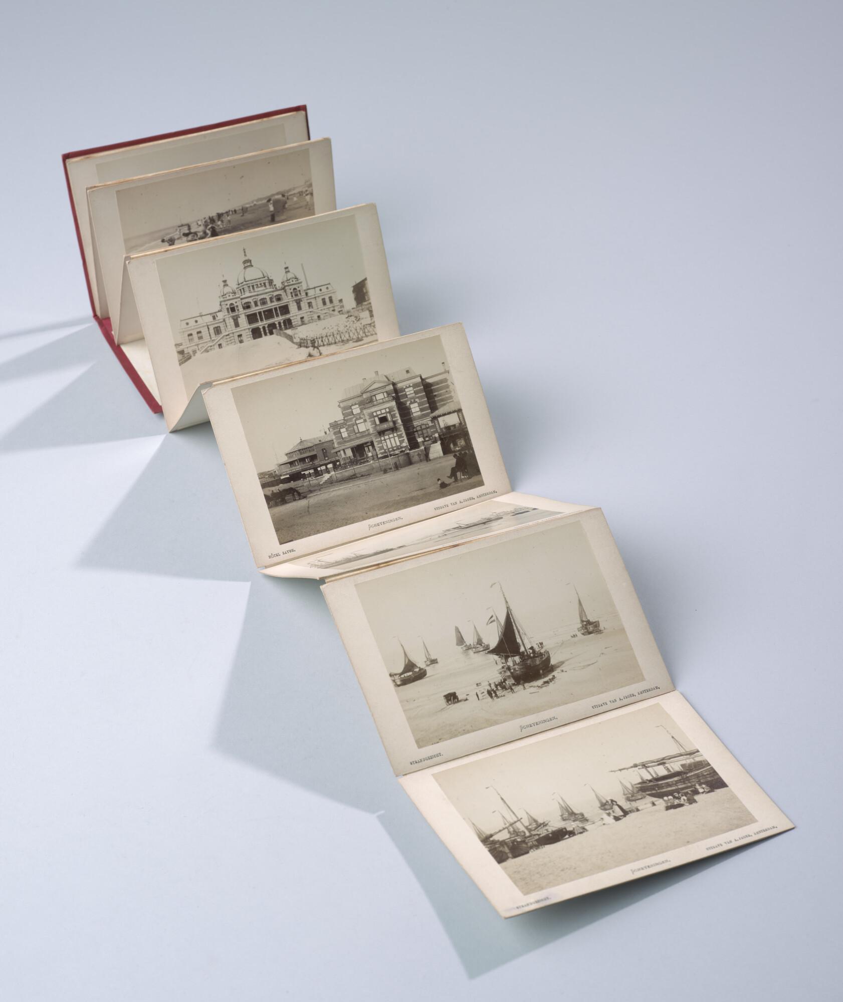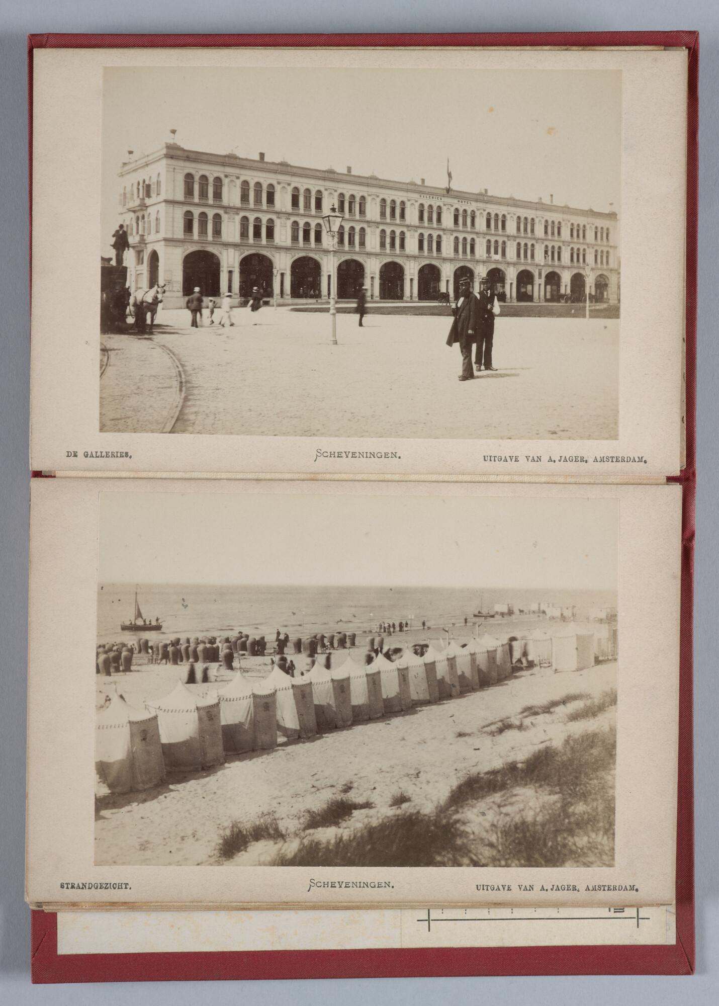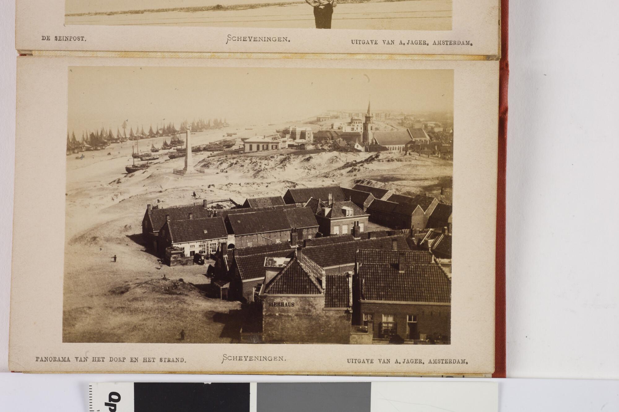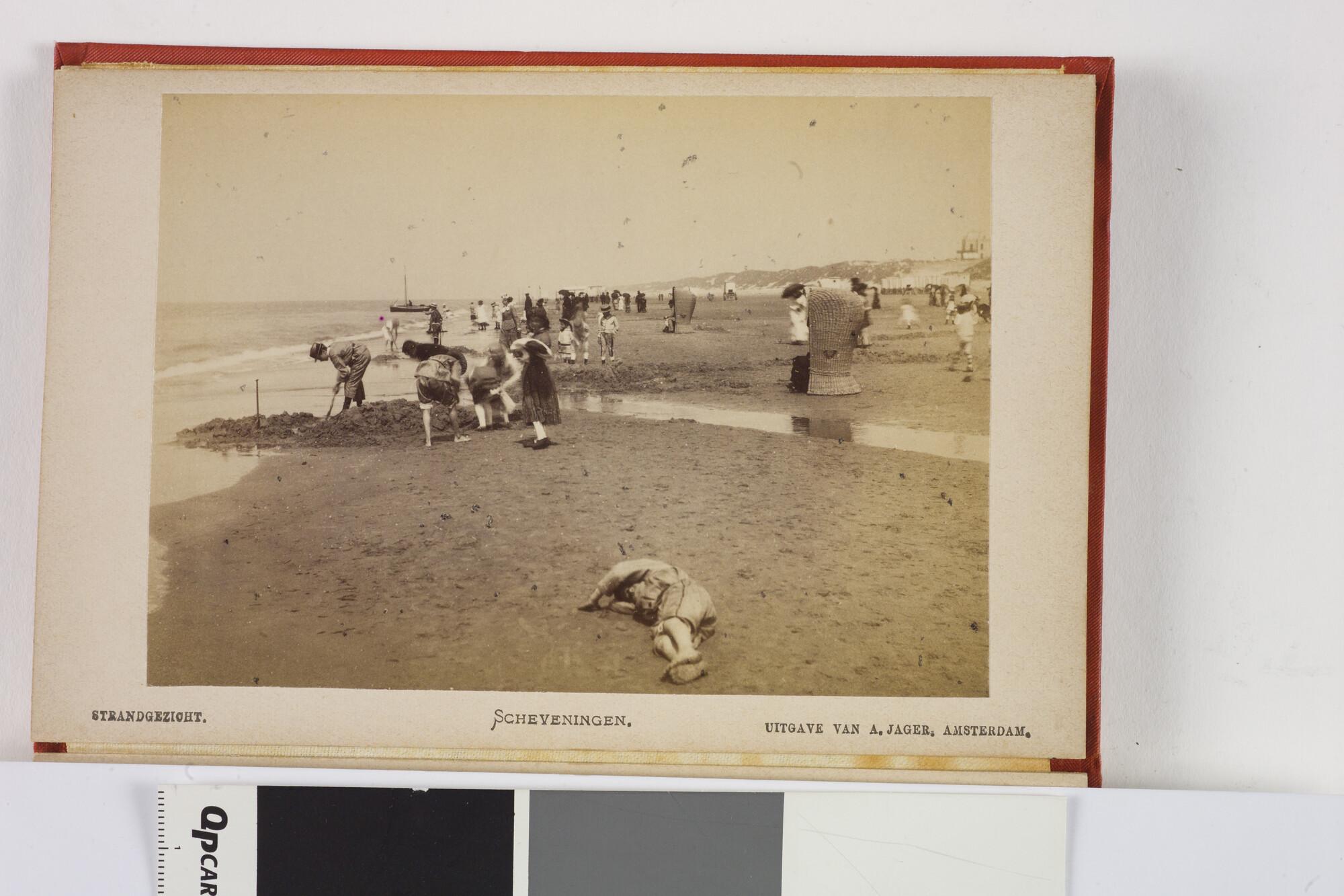 Mapje met 12 zwart-wit foto's van het dorp, het Kurhaus en het strand van Scheveningen met badgasten en vissersschepen omstreeks 1885.
