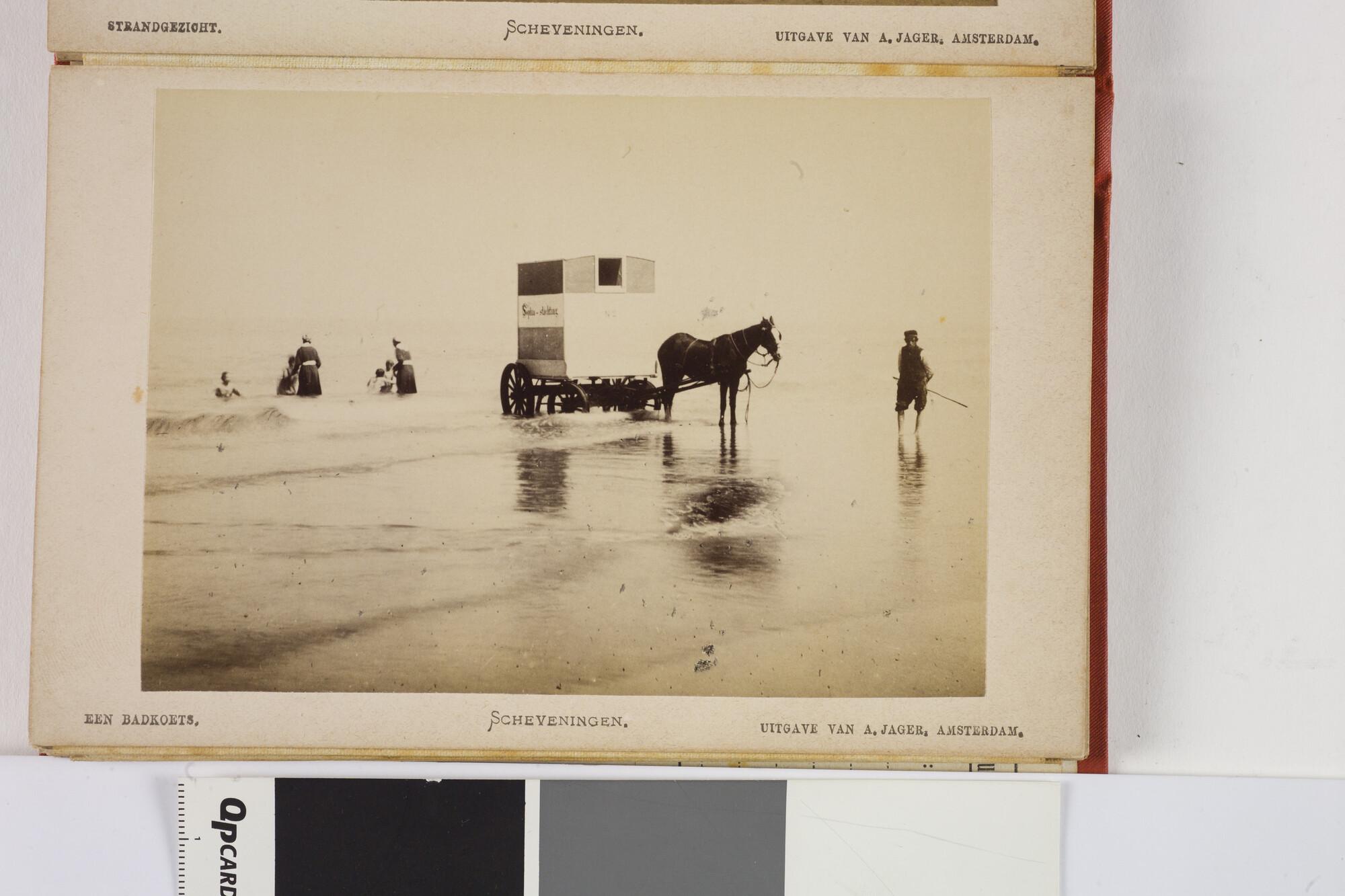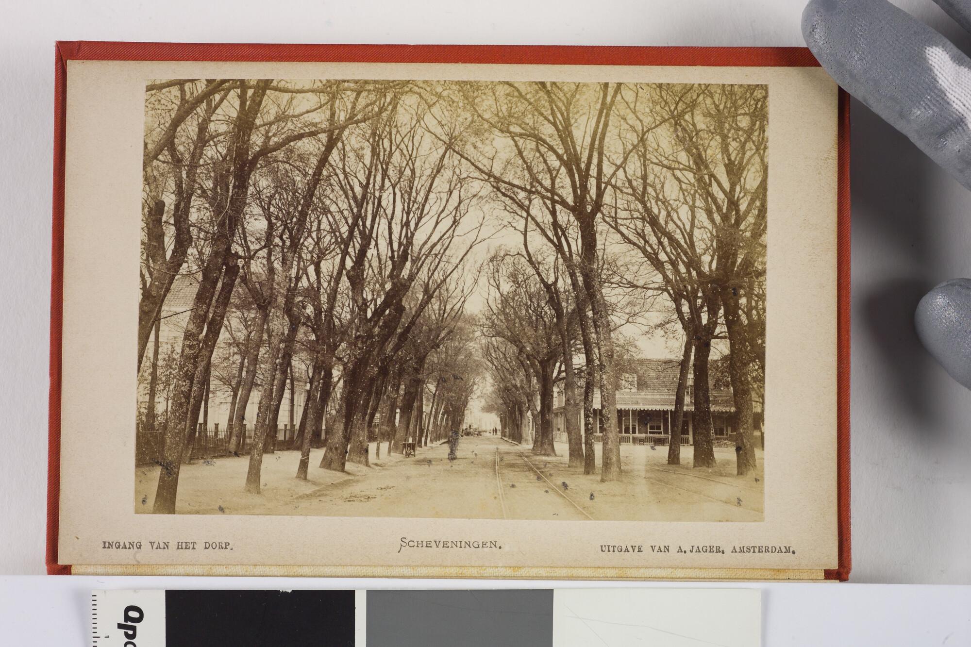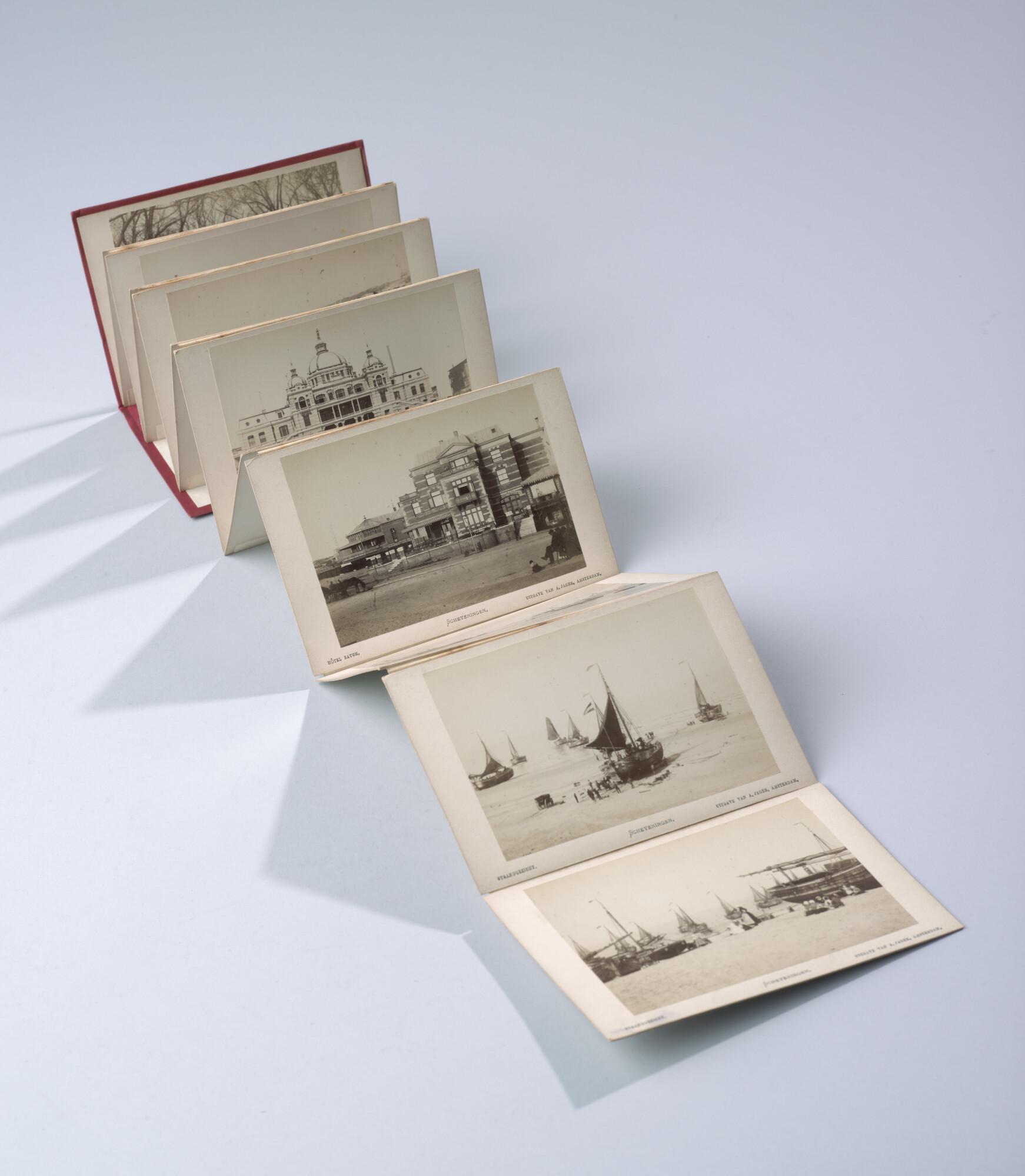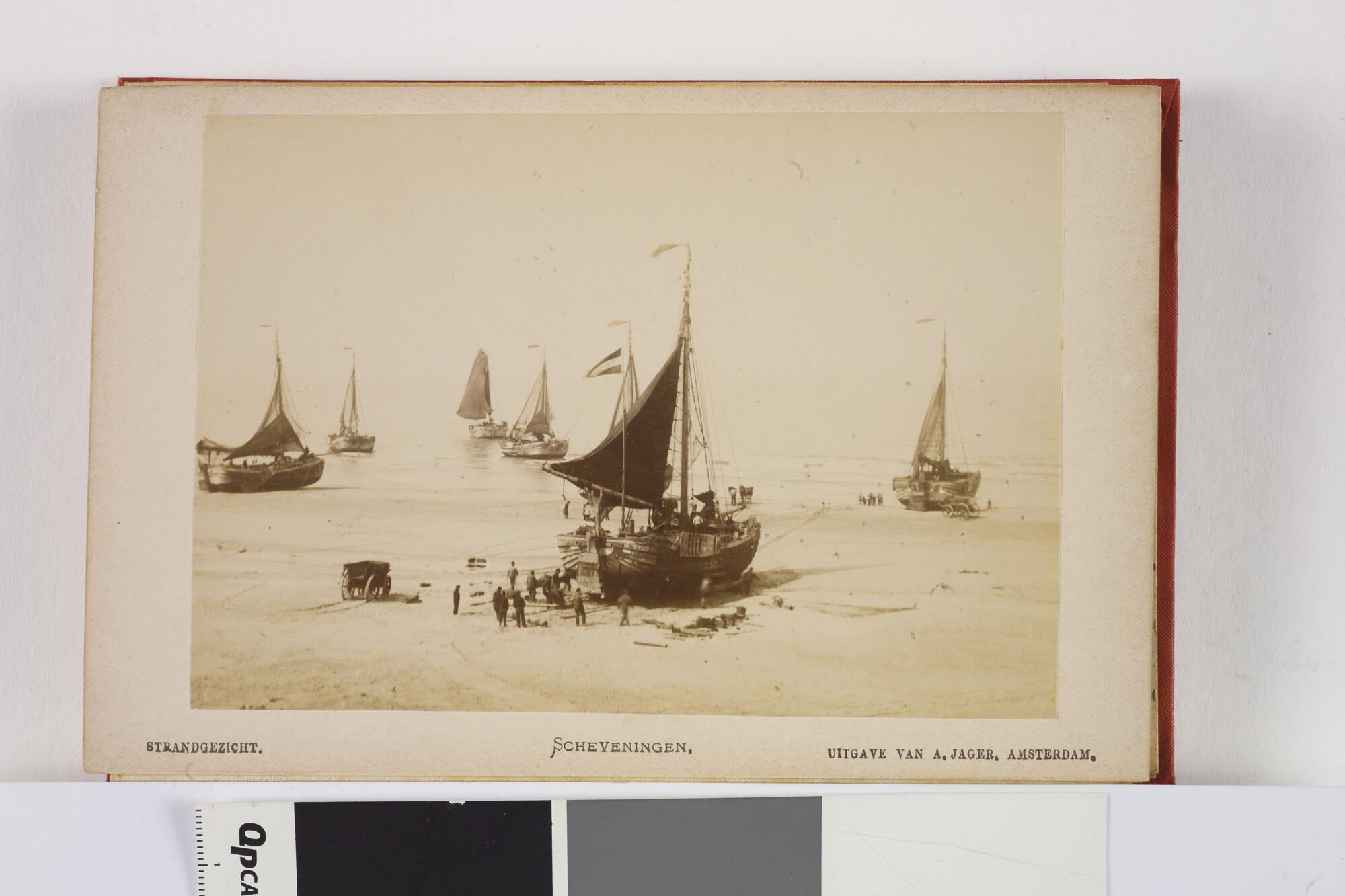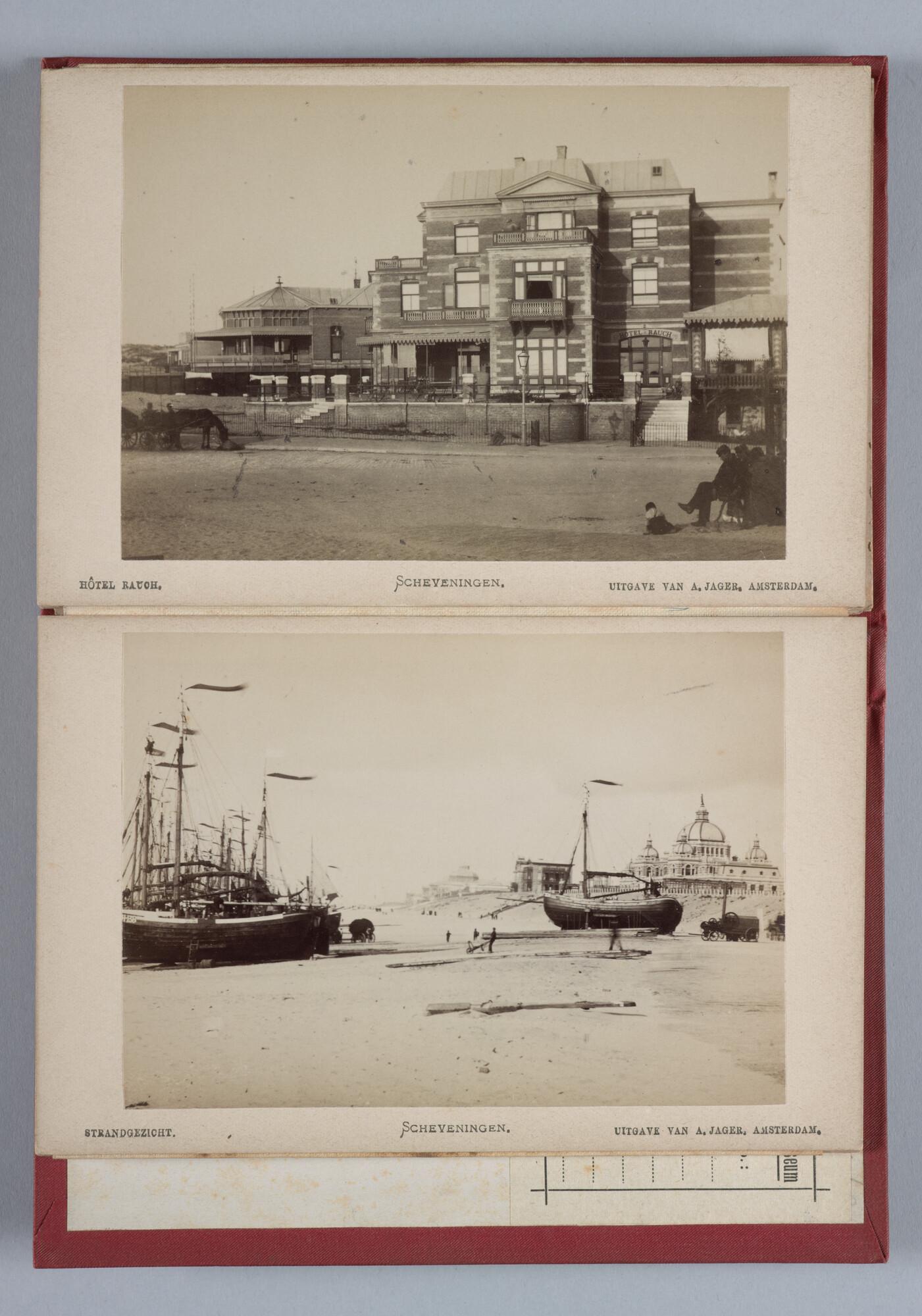 Mapje met 12 zwart-wit foto's van het dorp, het Kurhaus en het strand van Scheveningen met badgasten en vissersschepen omstreeks 1885.