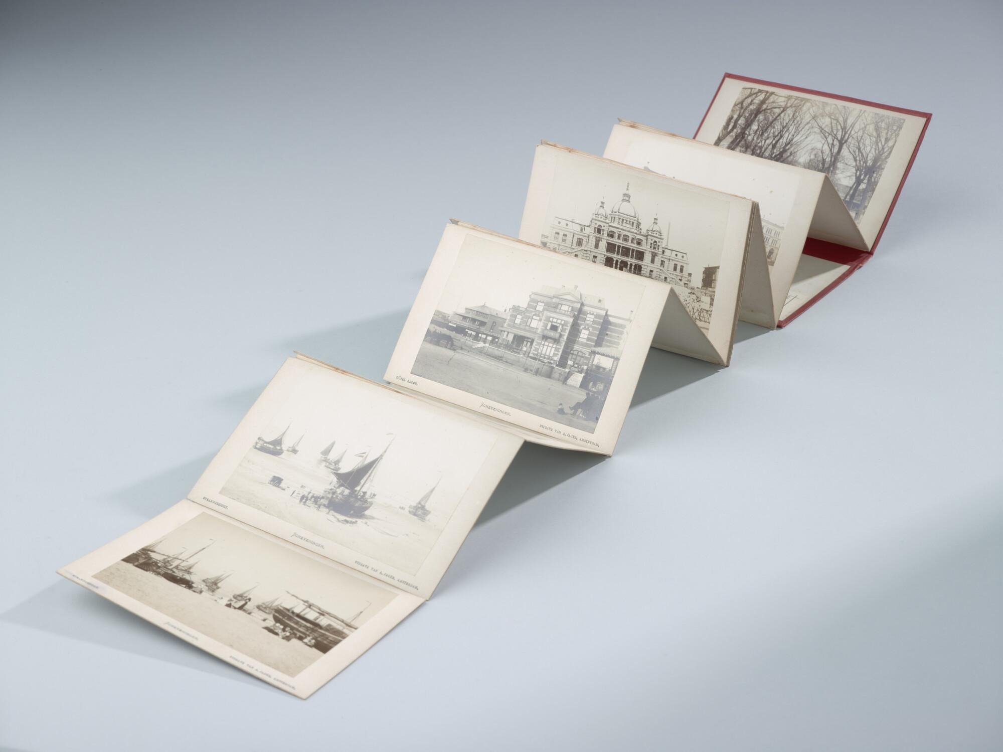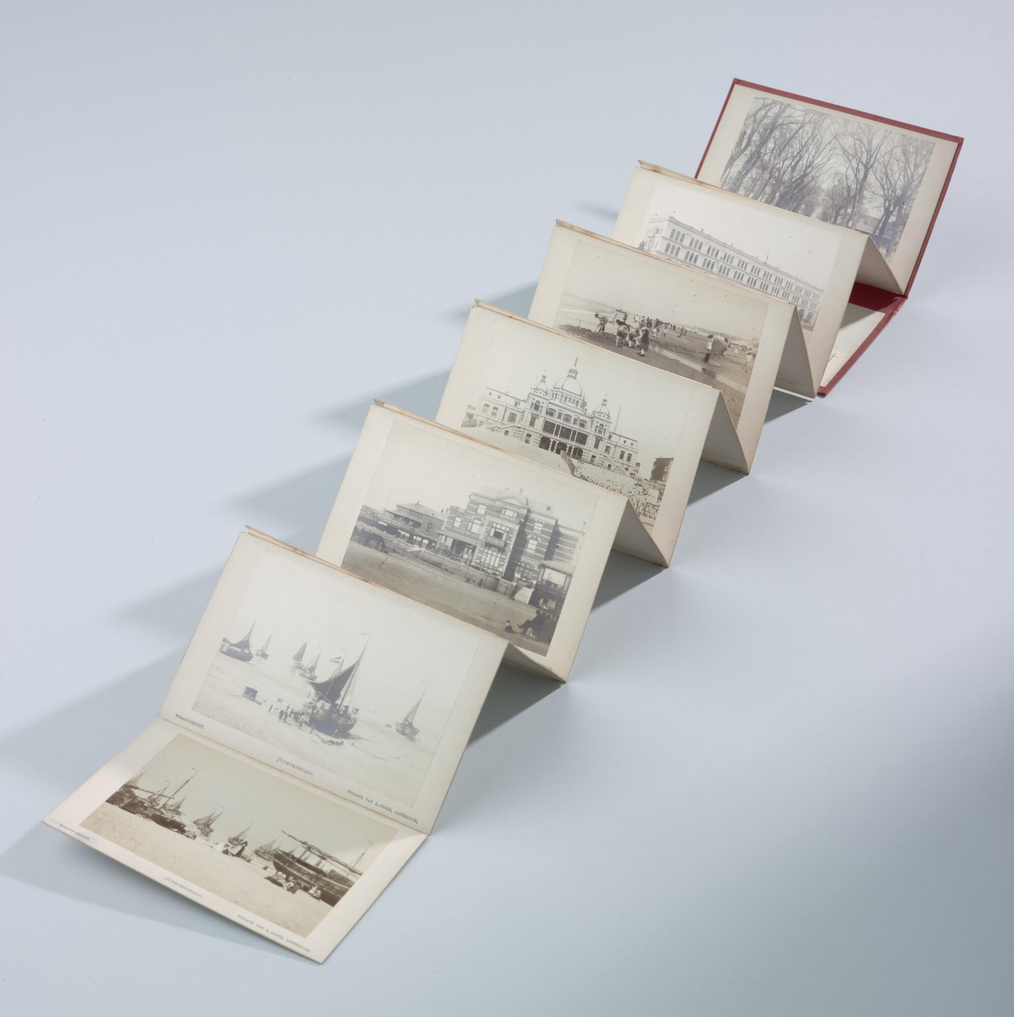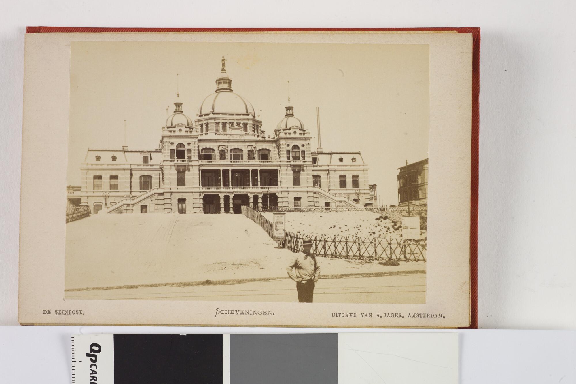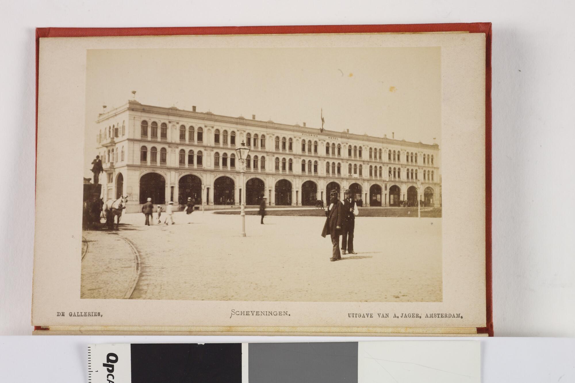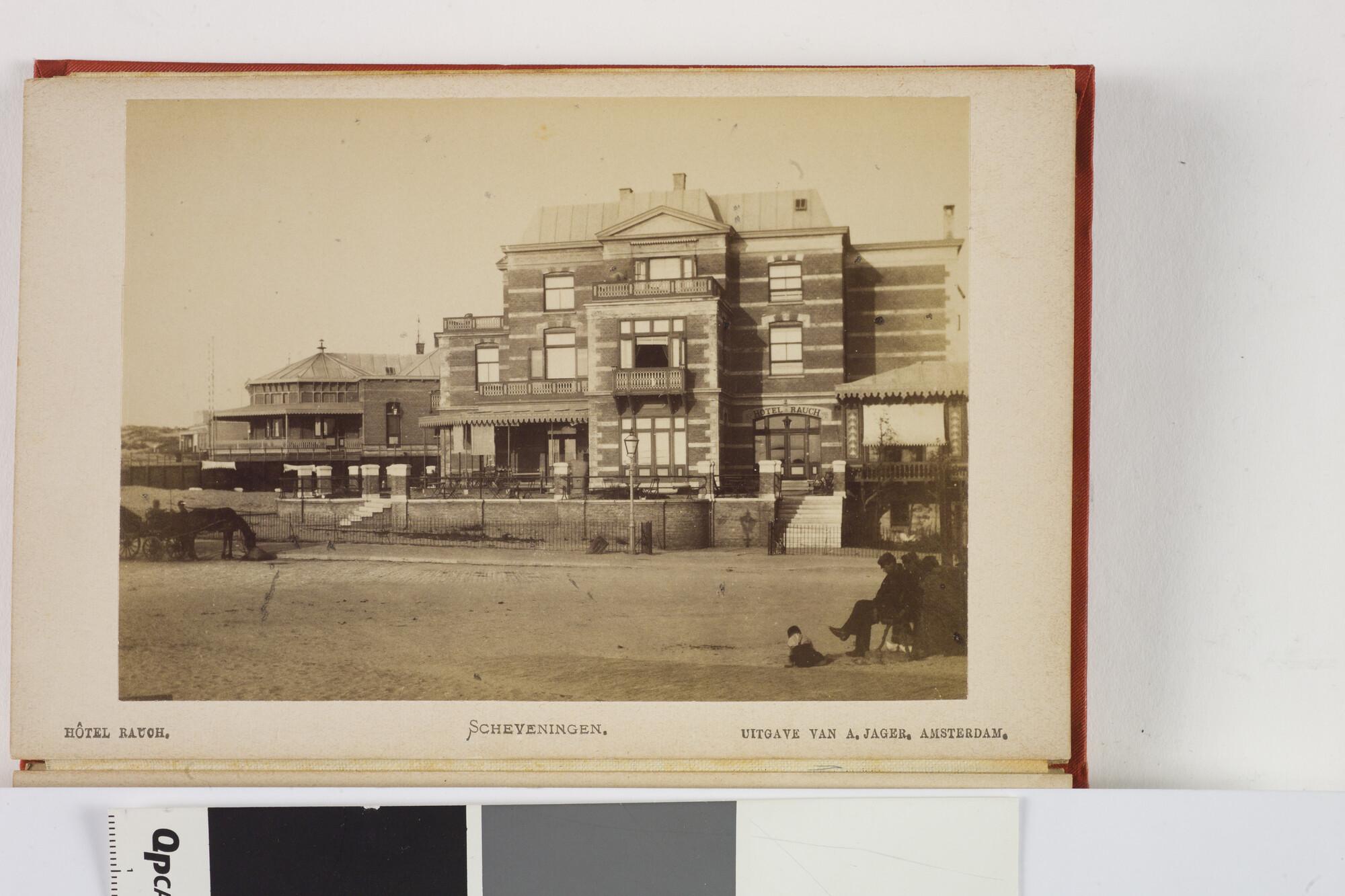 Mapje met 12 zwart-wit foto's van het dorp, het Kurhaus en het strand van Scheveningen met badgasten en vissersschepen omstreeks 1885.