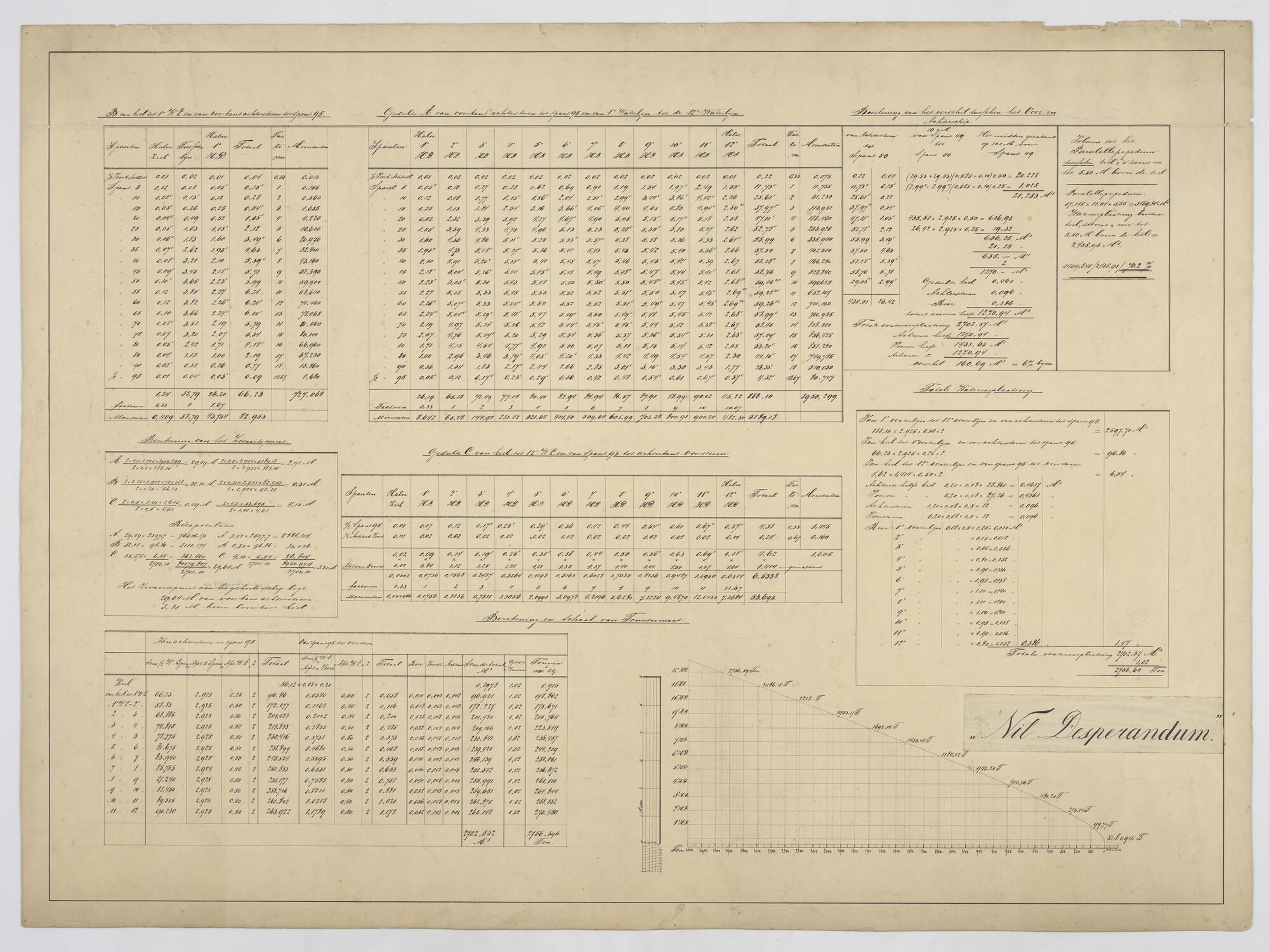 Spantenlijst, berekening waterverplaatsing en zwaartepunt van de bark "Nil Desperandum".