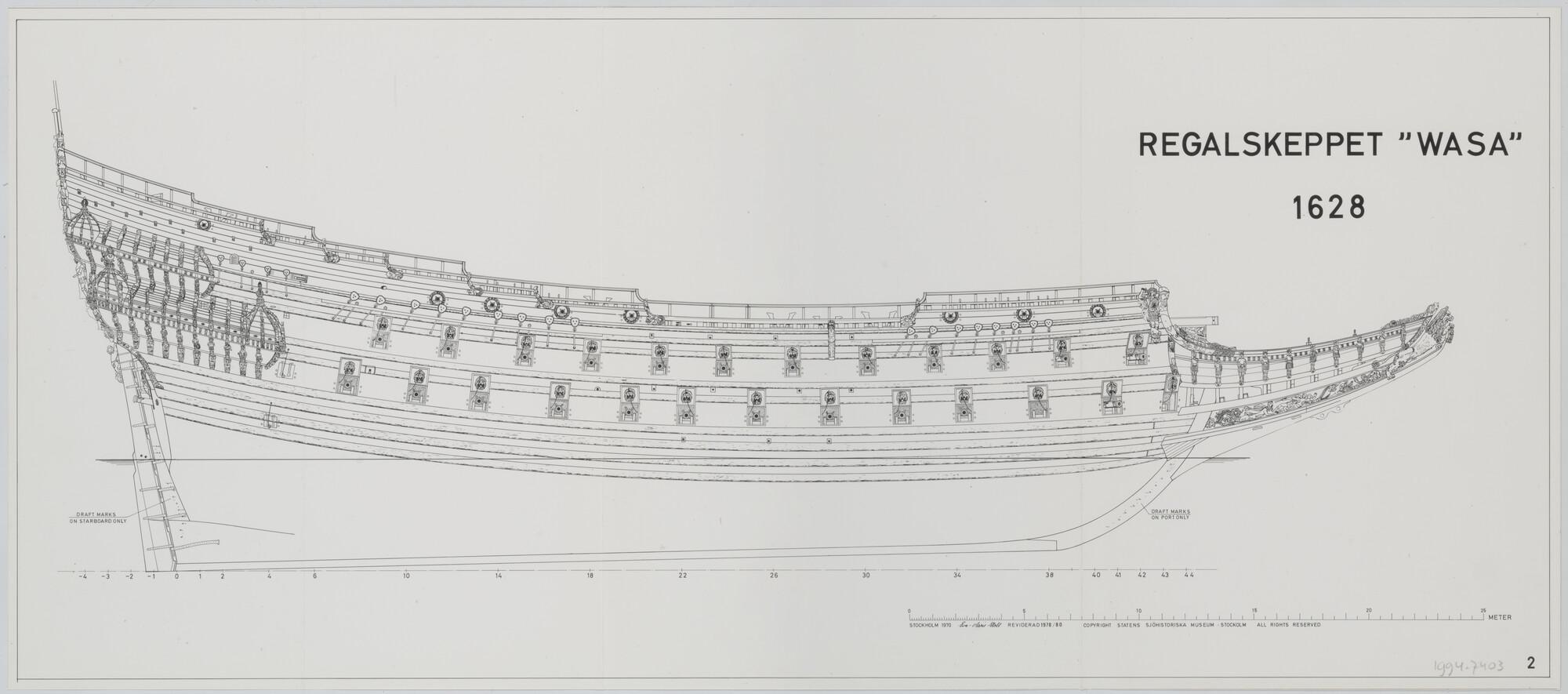 (Reproductietekeningen) Zijaanzicht van het Zweedse oorlogsschip "Wasa".